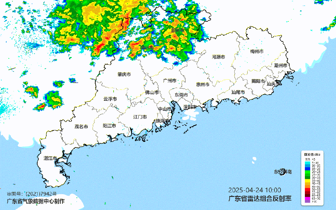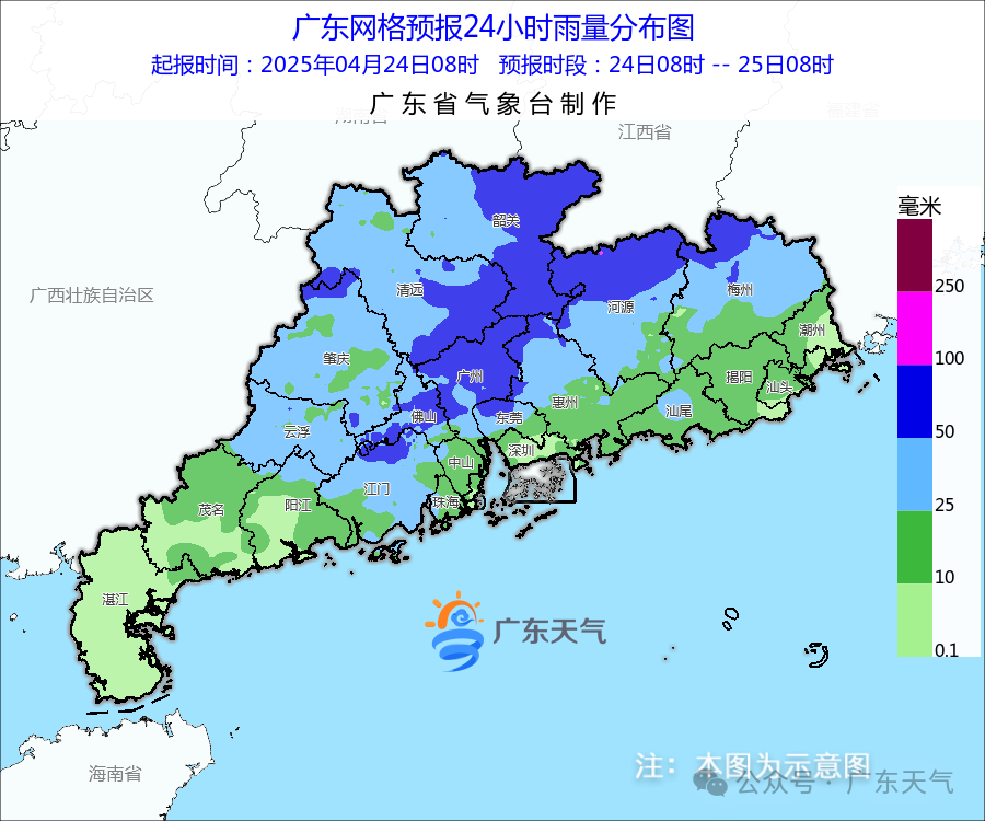 预计今明两天(24-25日),随着副热带高压南退,冷暖气流交锋区域将顺势南压全面影响我省,再加上强盛西南气流带来充沛水汽,粤北、珠三角仍有强降雨和强对流天气。强降水相对集中时段为24日白天到25日早晨,雷雨时伴有8~10级短时大风和冰雹等强对流天气。