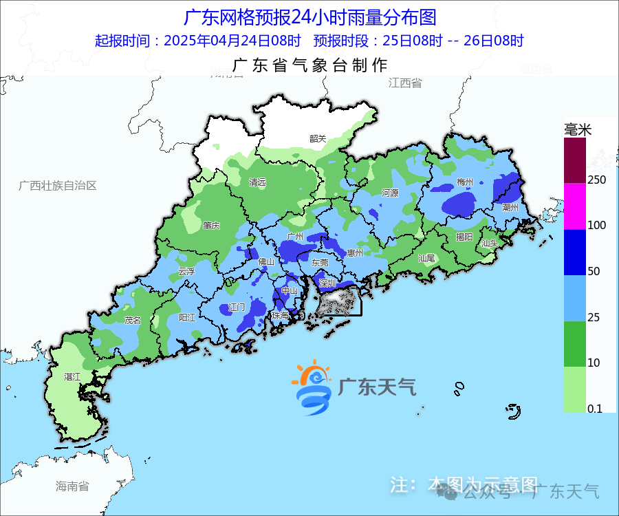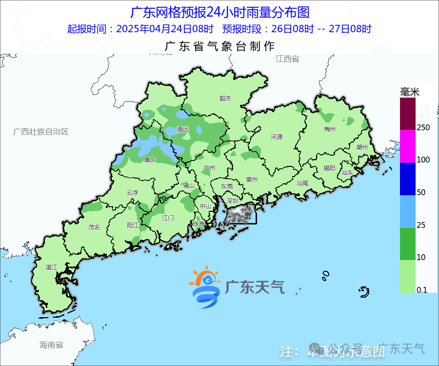 25日,中北部的降雨明显减弱,主雨区转战南部。珠三角南部、粤东沿海有大雨,局部暴雨,其余市县有分散(雷)阵雨。