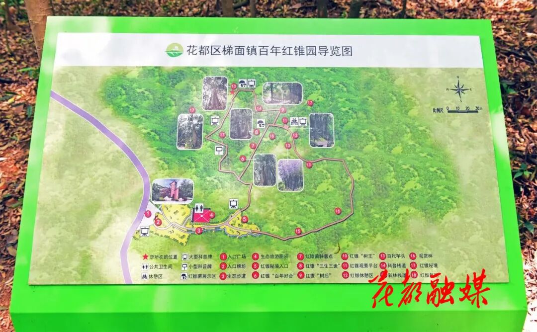 进入红锥园区,沿着依山而建的林间栈道拾级而上,眼前山花烂漫,耳畔鸟语啁啾,一切显得静谧而恬美,看着四周粗壮高大的红锥树,闻着山野草木特有的芬芳气息,一路行进,让人心旷神怡,惬意满怀。