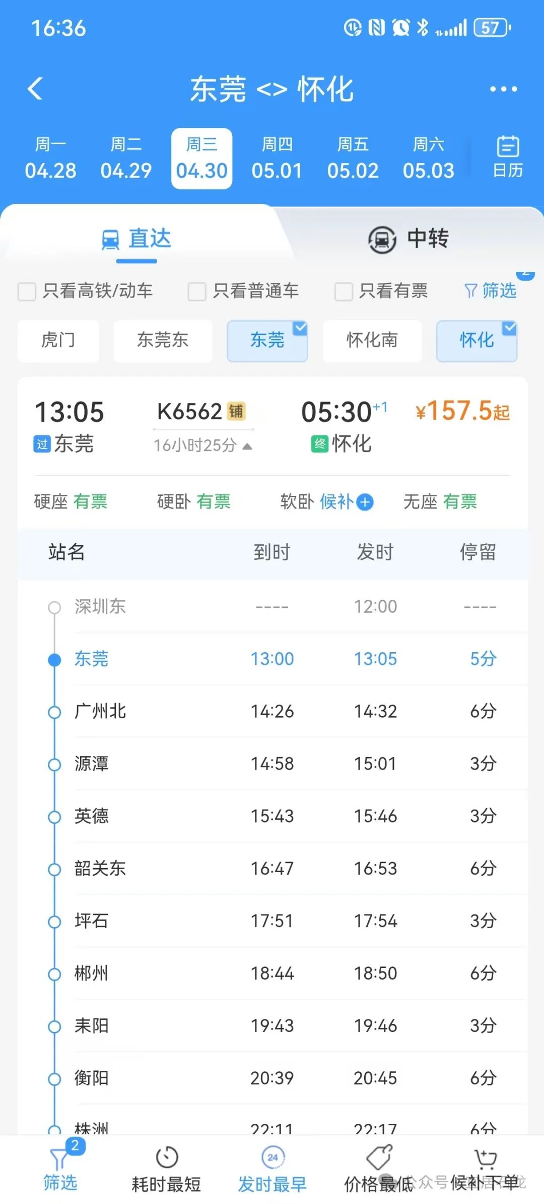 这趟车会经停东莞站和怀化站