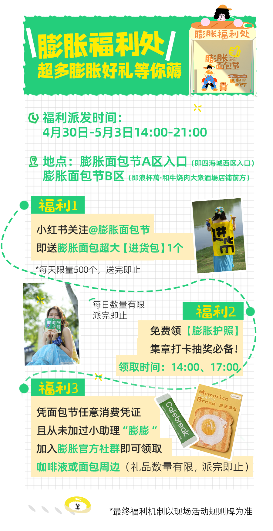 活动期间,前往膨胀福利处领取专属「膨胀护照」,这可是玩转面包节的关键道具!一本小小的护照,藏着超多惊喜,准备好探索这场面包派对吧~