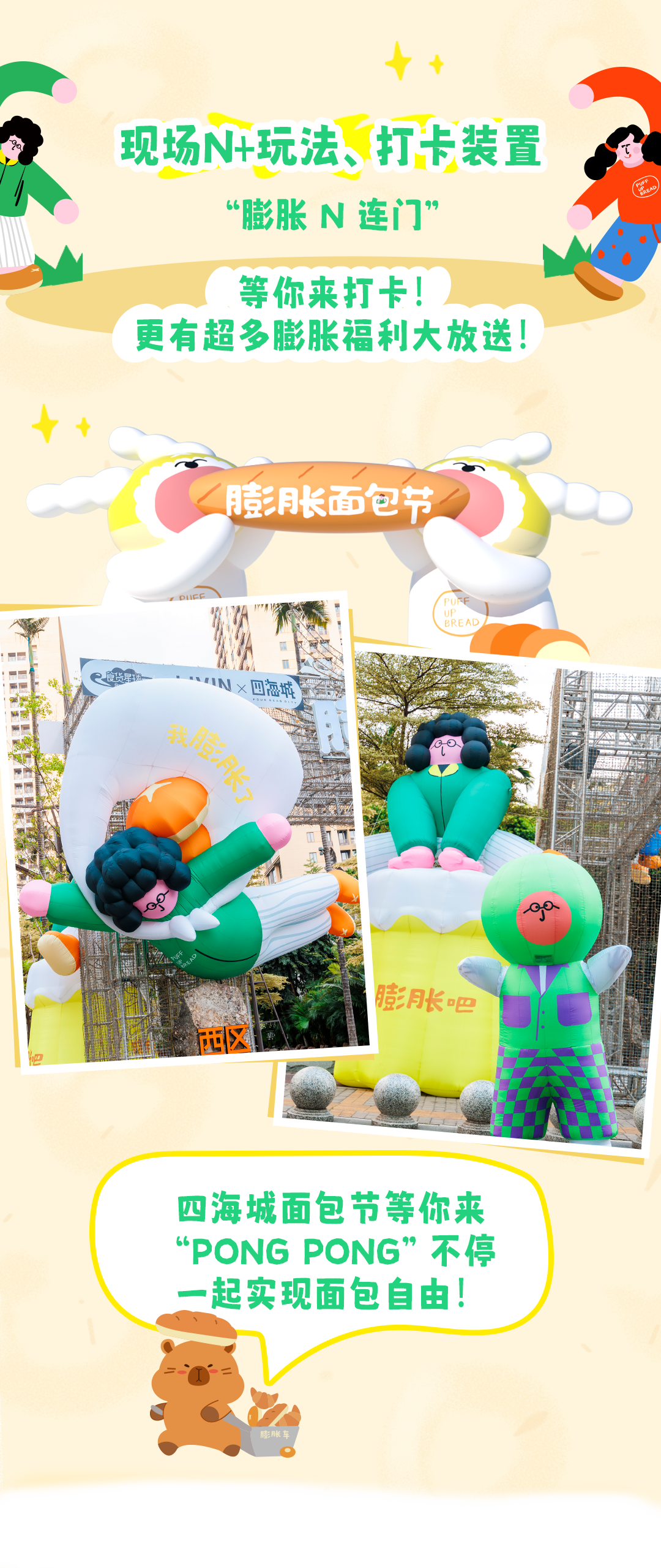 现场超多「膨胀门」打卡装置,超大面包充气门、小狗团团等,面包脑袋们一定要来打卡,随便一拍都是元气满满的大片,轻松刷爆朋友圈!
