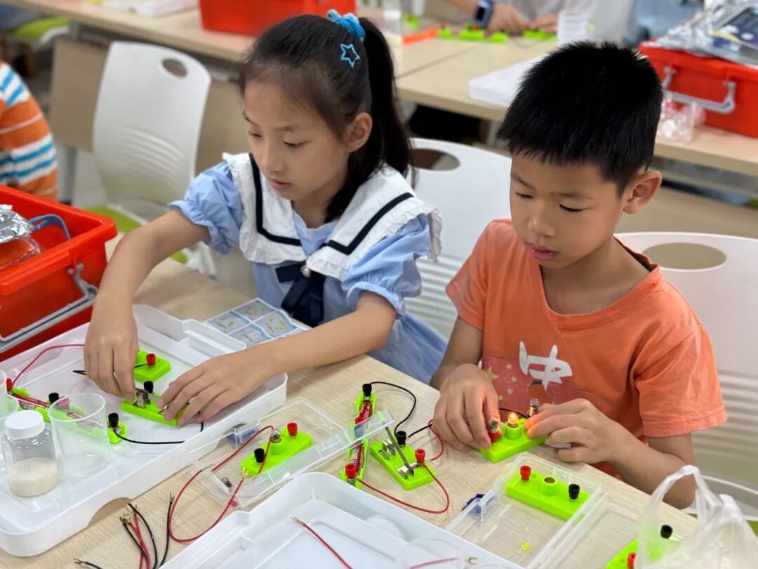 我们都知道很多金属能够导电,那溶液能不能导电呢?我们又该如何检测溶液是否具有导电性呢?就让我们跟随这节课的实验来揭晓答案吧。活动开始,老师向孩子们科普金属的导电性能,孩子们认识到银、铜、金、铝等金属具有导电性。在了解金属的导电性后,老师顺势提出疑问,溶液是否也和金属一样具有导电性呢?在好奇心的驱使下,孩子们分成小组,利用自来水、可乐两种溶液来测试溶液的导电性能。在老师的指导下,他们小心翼翼地将电池、小灯泡、导线等组装成串联电路,当看到插入自来水和可乐的电路中小灯泡明亮地亮起时,孩子们兴奋地欢呼起来,这一现象证实了他们之前关于自来水和可乐能够导电的猜想。
