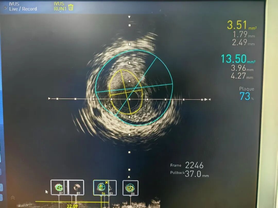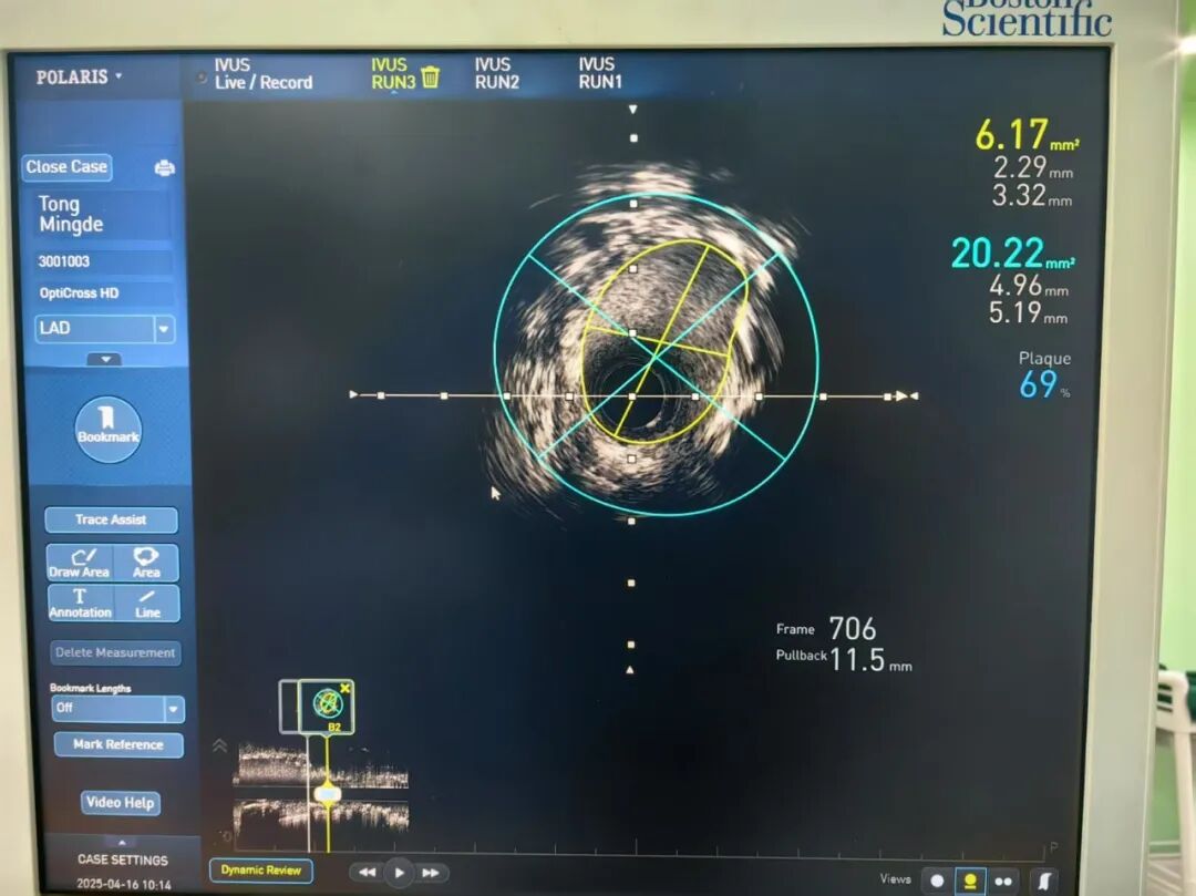 林茂欢副主任医师带领团队使用IVUS(血管内超声)技术辅助诊断,证实该处管腔面积明显狭窄,最终为他精准植入两枚支架。术后,患者管腔面积显著增加,症状完全缓解。这一手术的成功实施,标志着花都院区冠脉精准介入诊治迈入了新的阶段。