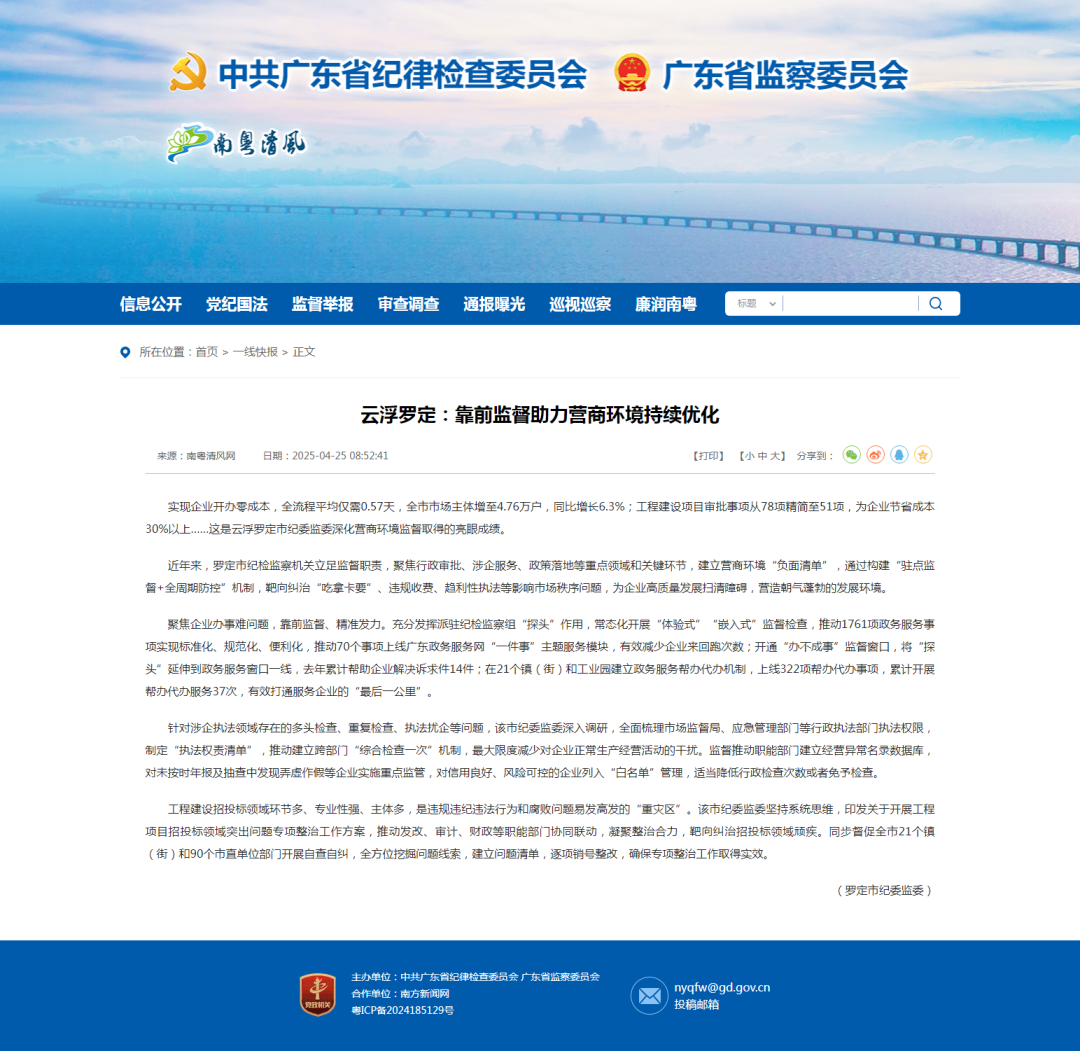4月25日,南粤清风网载文《云浮罗定:靠前监督助力营商环境持续优化》,介绍了罗定市纪委监委聚焦行政审批、涉企服务、政策落地等重点领域和关键环节,建立营商环境“负面清单”,通过构建“驻点监督+全周期防控”机制,靶向纠治“吃拿卡要”、违规收费、趋利性执法等影响市场秩序问题,为企业高质量发展保驾护航。