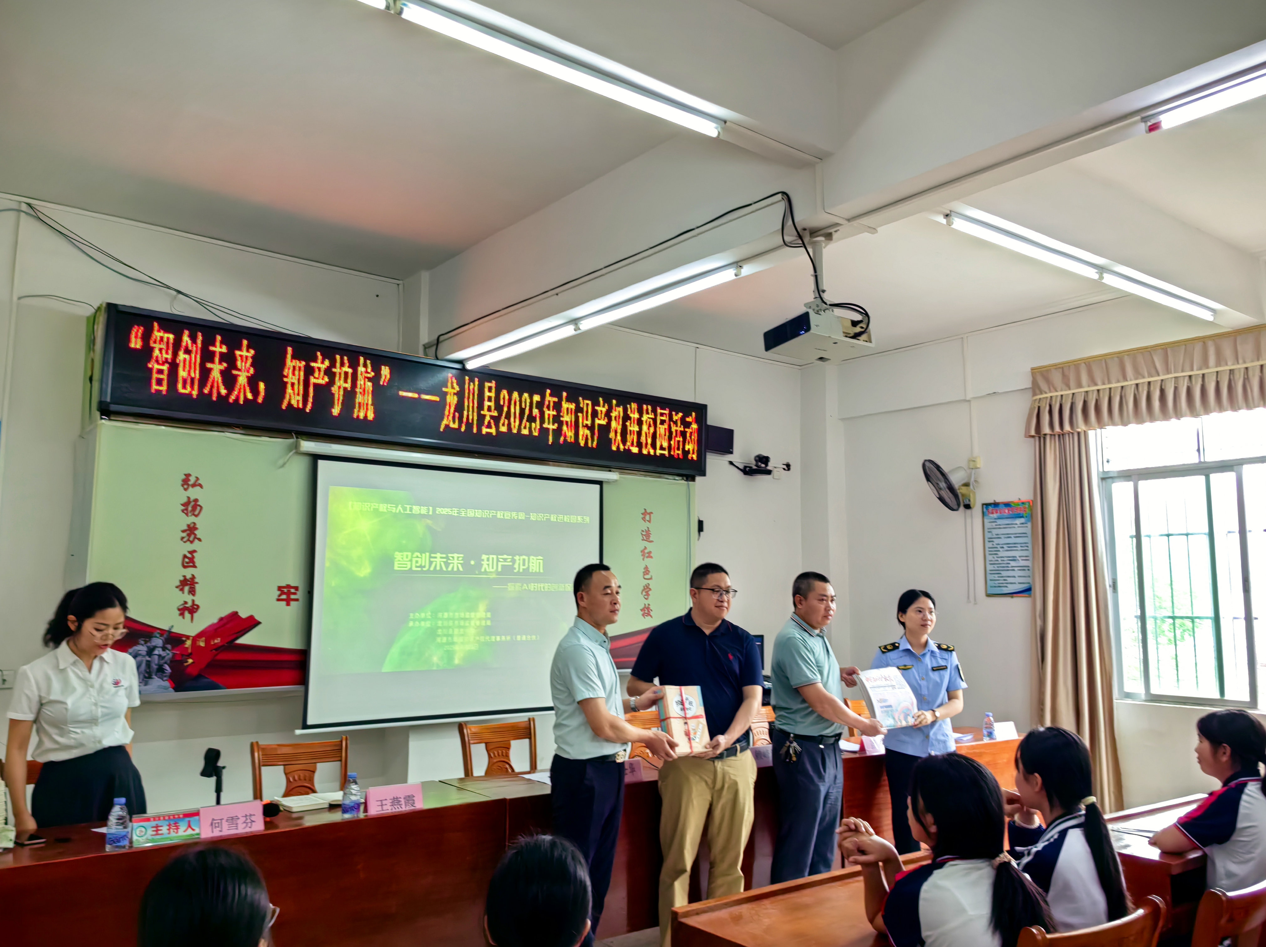 活动中,河源市市场监督管理局向廻龙中学赠送了一批知识产权教育书籍;河源市华标知识产权代理事务所王燕霞应邀为广大师生作了以“智创未来·知产护航——探索AI时代的创新保护”为主题的知识课。