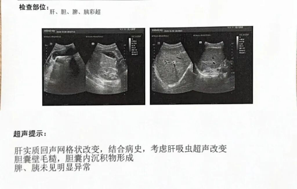 60多岁的财叔(化名),因胆总管结石伴反复腹痛不适来到我院就医,B超显示患者肝脏被虫体侵蚀,胆囊内有大量沉积。