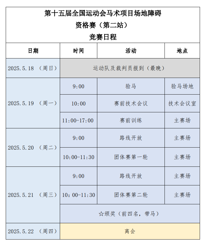 第一赛马网获悉,4月28日,中国马术协会(以下简称“中马协”)在其官方网站发布了《关于举办第十五届全国运动会马术项目场地障碍资格赛(第二站)的通知》。根据通知,本次资格赛(第二站)将于2025年5月19日(周一)至5月21日(周三)在浙江省杭州易骏马术俱乐部隆重举行。报名通道已于通知发布当日开启,截止时间为2025年5月12日下午16:00。