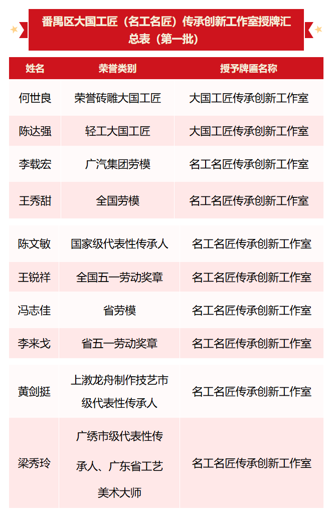在“五一”国际劳动节来临前夕,番禺区全面开展“匠人 匠心 匠品”传承创新系列活动,评选出10个大国工匠(名工名匠)传承创新工作室,涵盖汽车制造、传统工艺、岭南文化等十个类别,大力弘扬劳模精神、劳动精神、工匠精神。