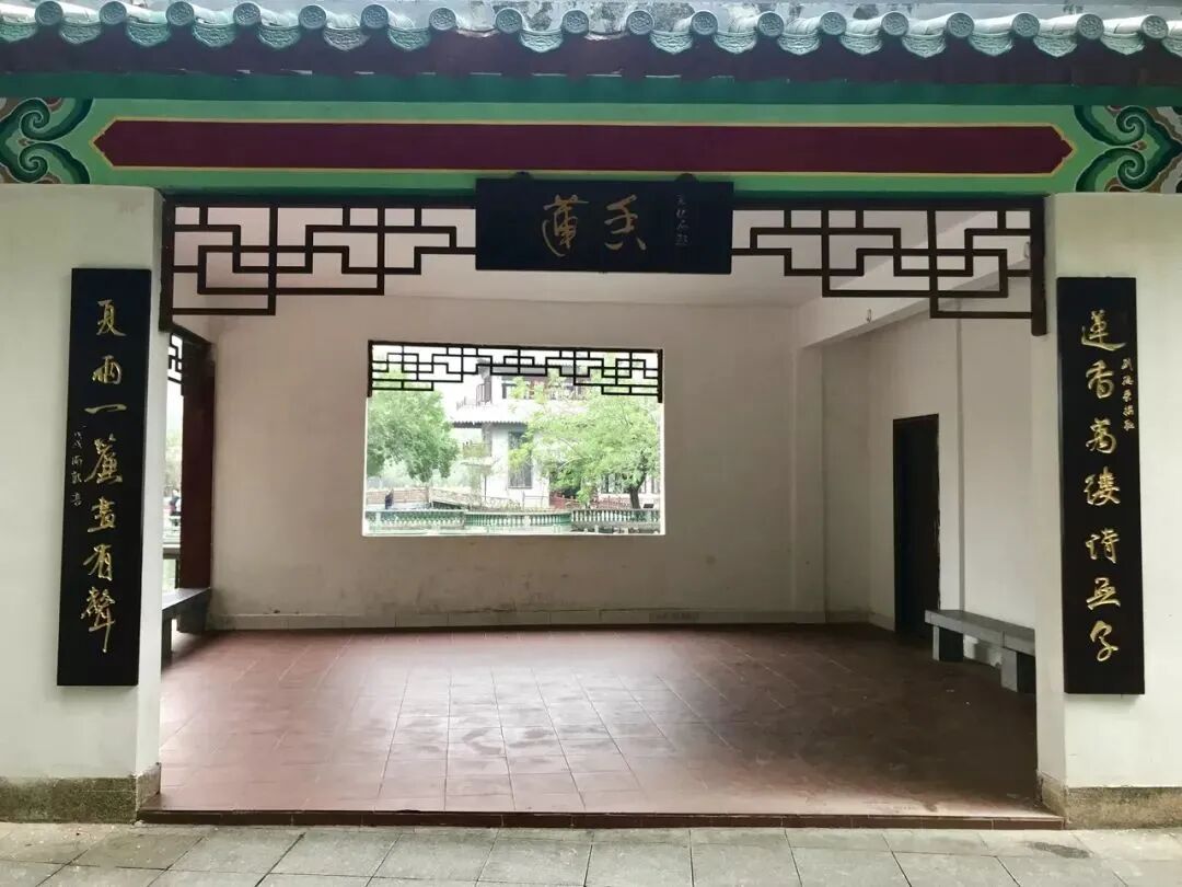 桂花轩长廊位于犀牛岗南麓,建于1959年9月。主间挂郭沫若书“桂花轩”匾,正门悬挂郭沫若手迹楹联一副:“风景这边独好,江山如此多娇。”桂花轩正对藻荇交横的红莲湖和七星桥。现正进行“星湖十景”图片展。