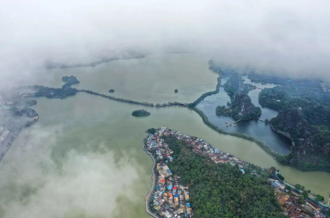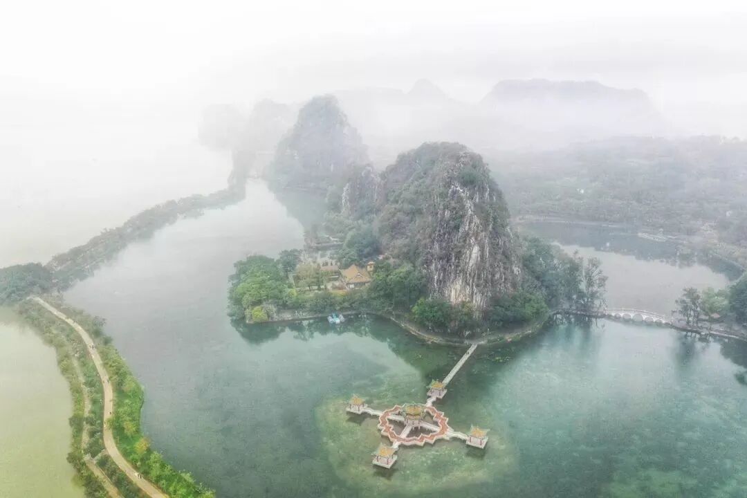 红莲桥是星湖十景之一"星岩烟雨"的最佳观赏点。每当雨季来临,常见烟雾缥缈于山水间,群峰隐隐,朦朦胧胧,一片清秀迷人,如入梦幻仙境。