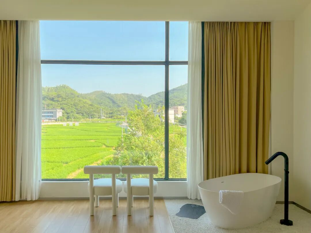 创新打造了"客家院落式"套房群,十余栋独立而相连的雅致套房错落分布,既传承了围屋聚落文化,又能满足现代家庭私密与共享的双重需求。建筑群在稻田与湖光间勾勒出灵动的天际线,让每个家庭都能找到属于自己的诗意栖所。