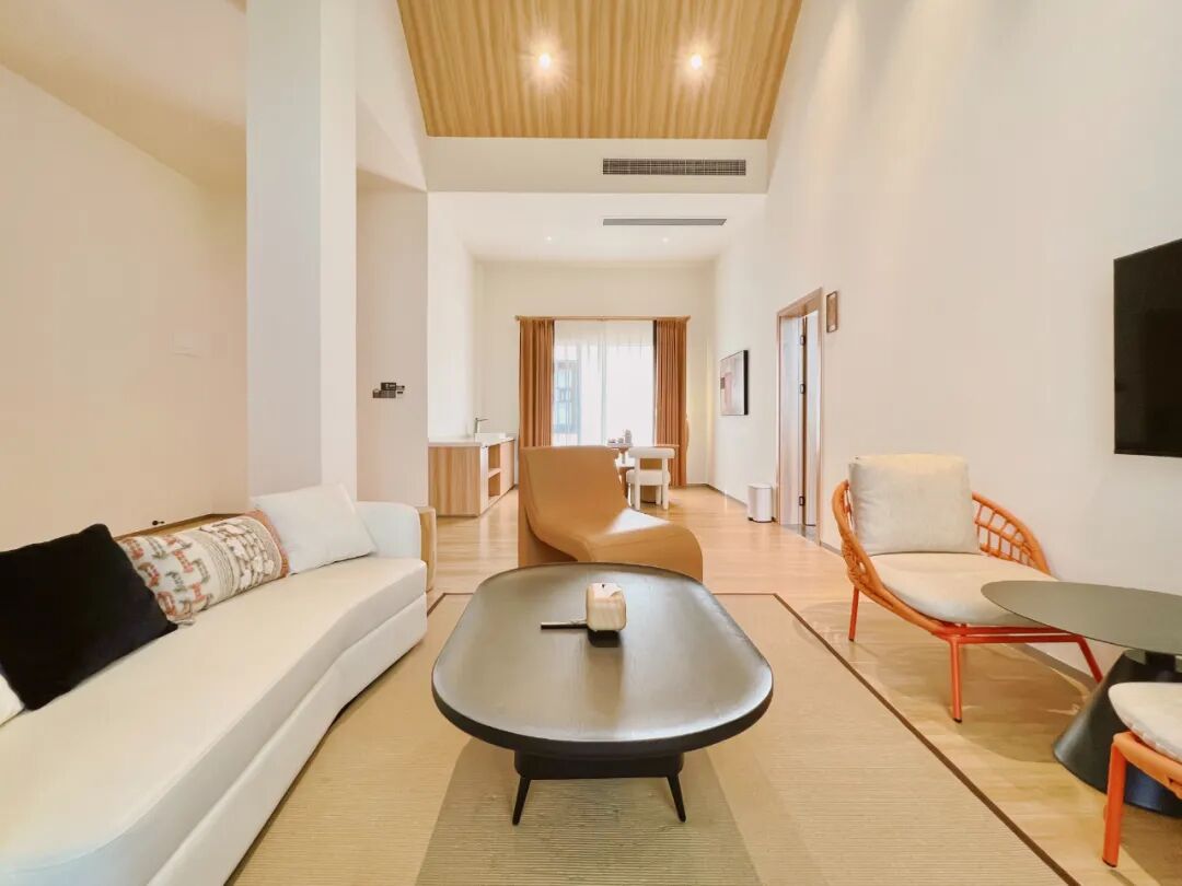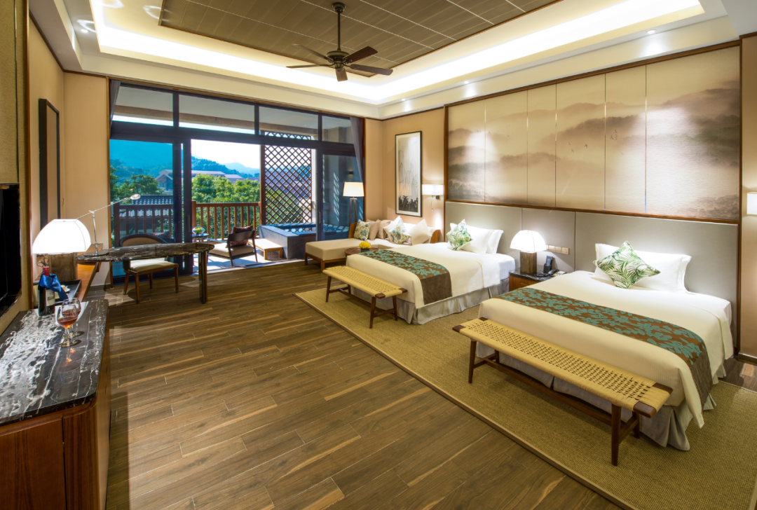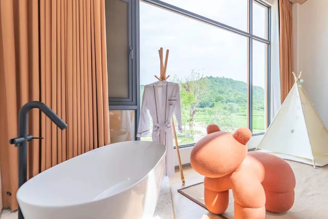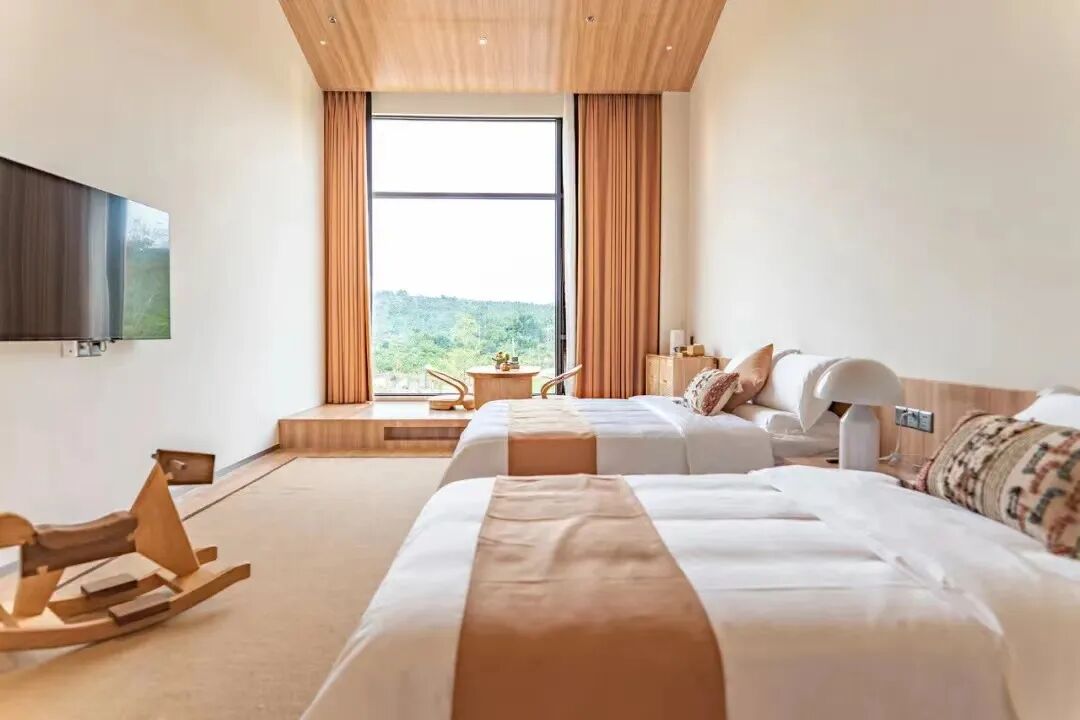 34间匠心打造的客房各具韵味,全景落地窗将连绵山色引入室内,观景阳台让您与自然零距离相拥。特别设计的亲子房充满巧思,独立儿童区配备迷你滑梯、梦幻小帐篷等趣味设施,让萌娃尽情嬉戏,为家庭旅行增添温馨乐趣。