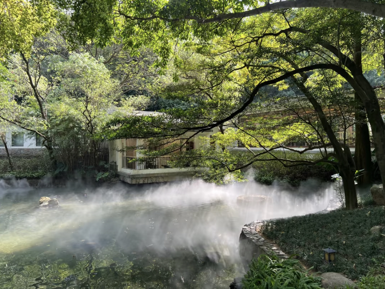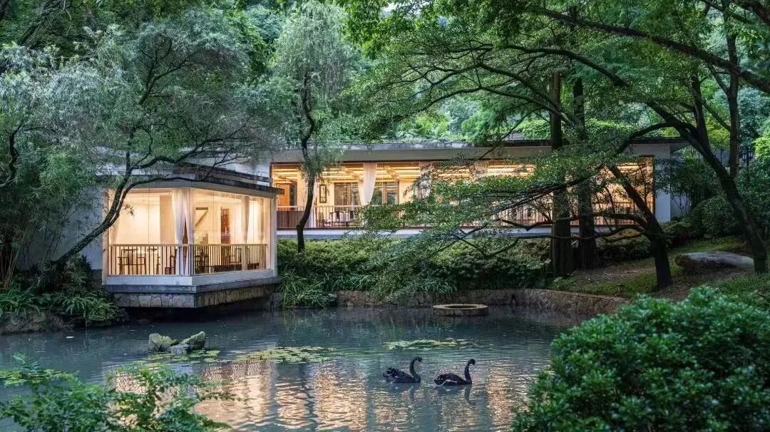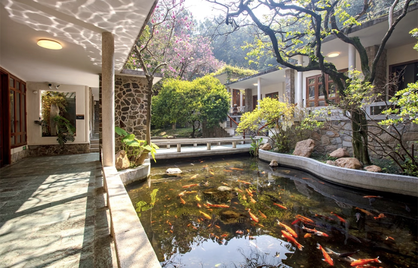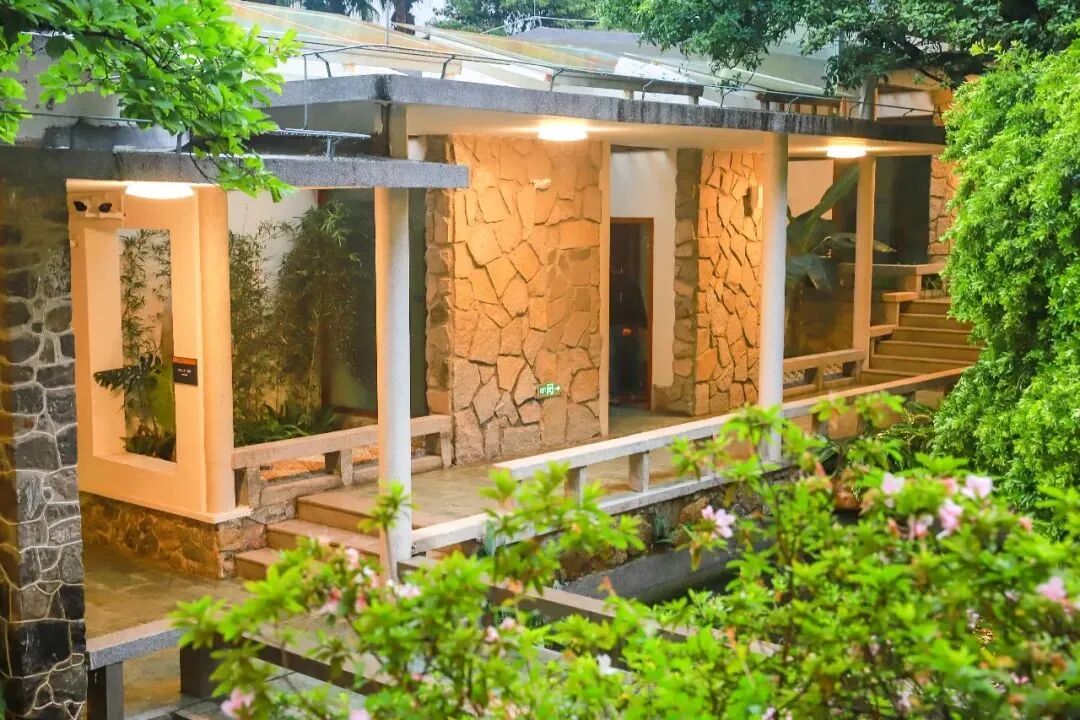 山庄旅舍整体依山势而建,将园林与山水融为一体。漫步其间,曲廊流水绕庭而过,是现代岭南庭园与岭南建筑发展的开创性突破的经典之作。