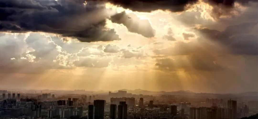 余晖如绸,温柔包裹。金色、橘红、湛蓝、洁白、黛青和远处的人间烟火交相辉映,是色彩的碰撞,是光影的融合。