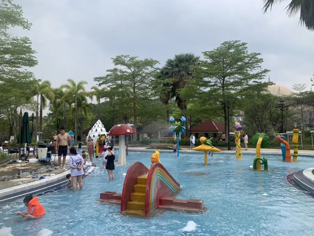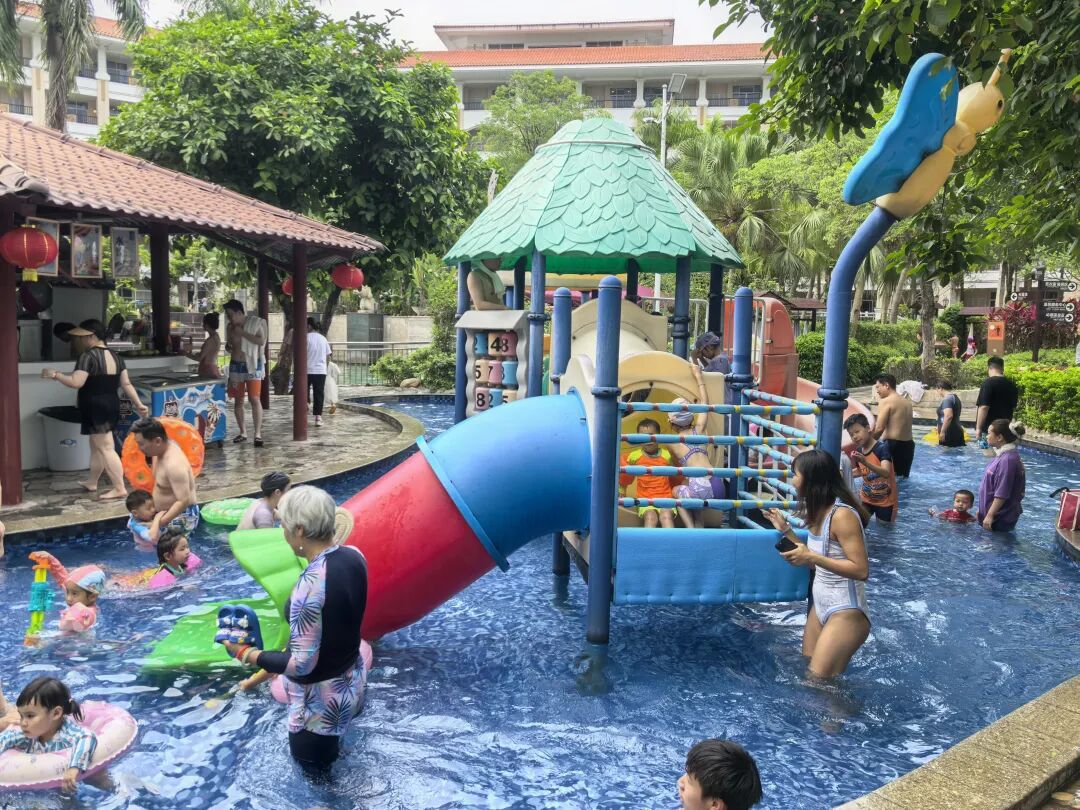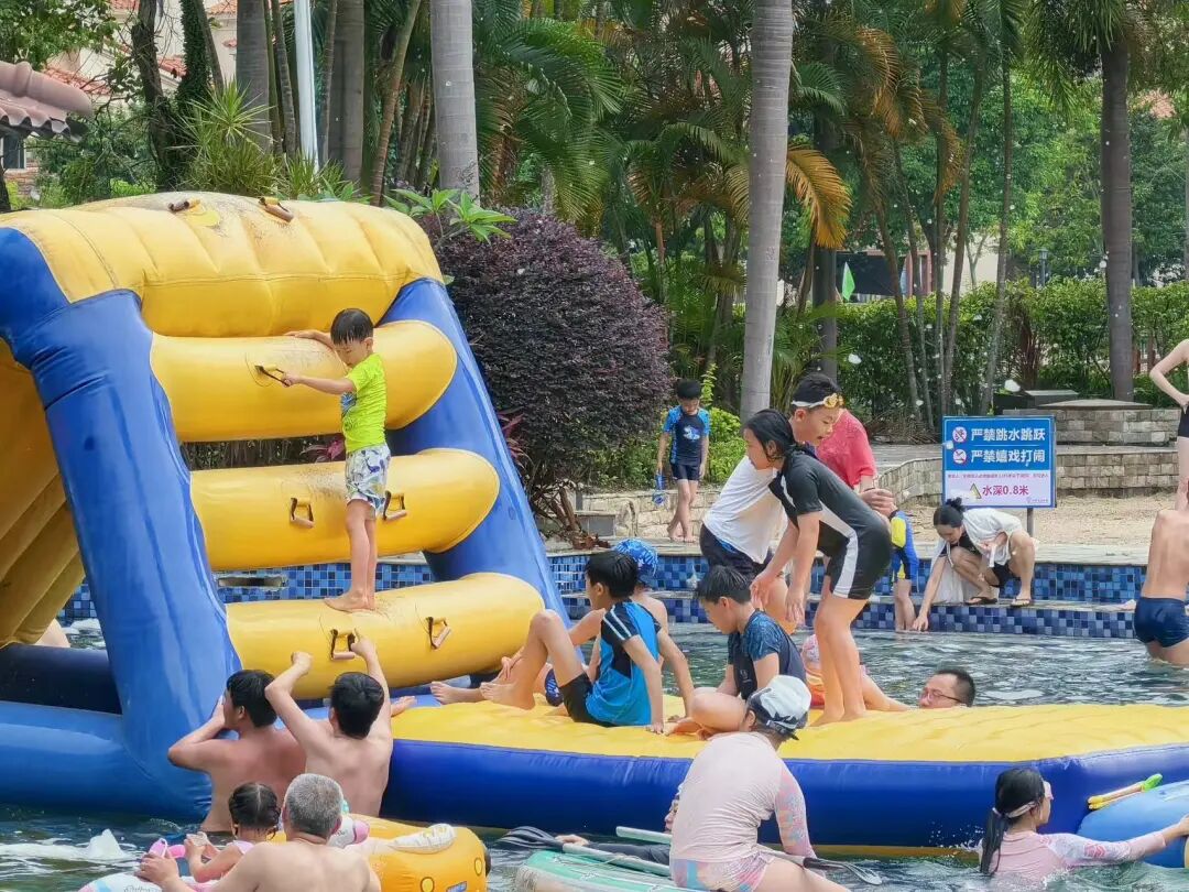 在山泉湾温泉城,游客在温泉池中尽情享受恩平优质温泉带来的放松与愉悦。池区内还设有大型的充气障碍赛道和各种大小游乐设施,孩子们欢快地穿梭其间,自由嬉闹。