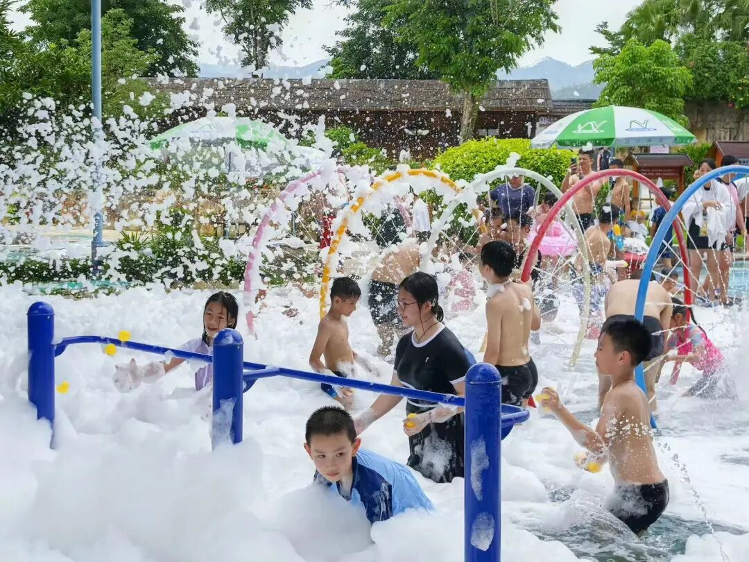 记者走访锦江温泉看到,冲浪池内欢笑声与激荡水花交织成一首活力乐章,儿童池内五彩缤纷的泡泡给池水增添了一层梦幻的色彩,孩子们在漫天飞舞的泡泡中追逐嬉戏。