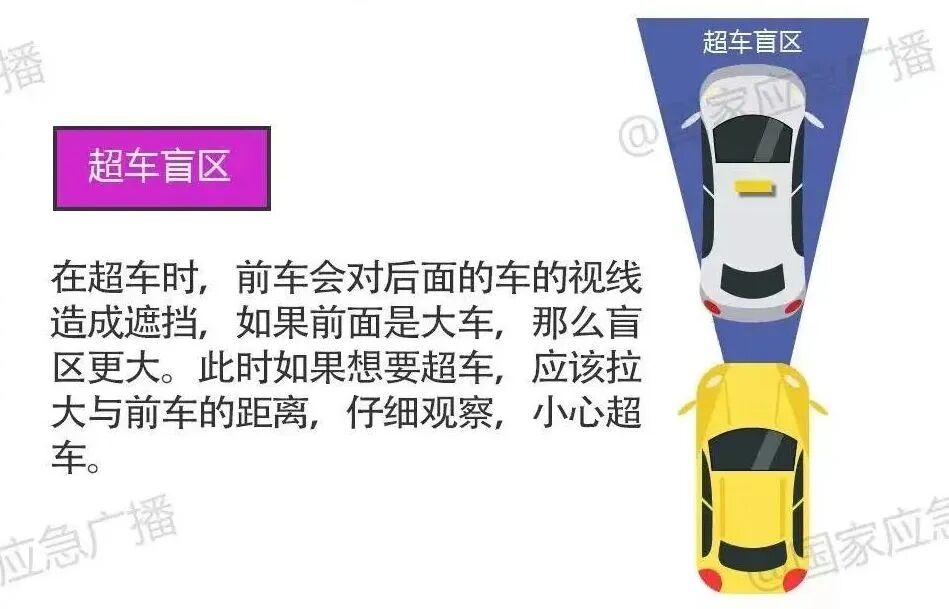 3.超车盲区:超车时,后车视线会被前车遮挡,可能无法观察到对向来车。特别是要超越大型车辆时,超车盲区更大。