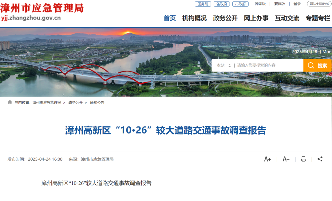 近日,福建省漳州市应急管理局公布《漳州高新区“10·26”较大道路交通事故调查报告》。