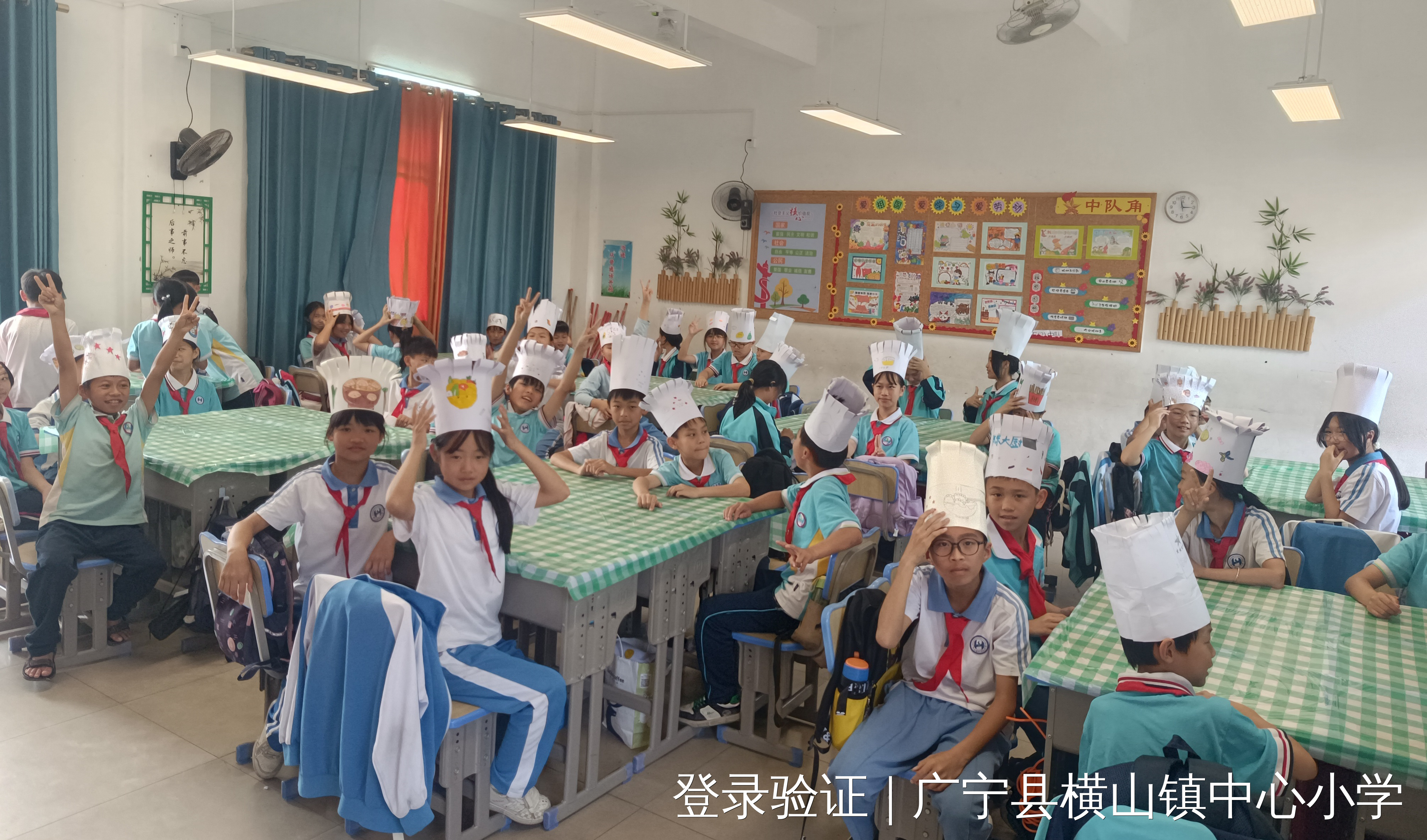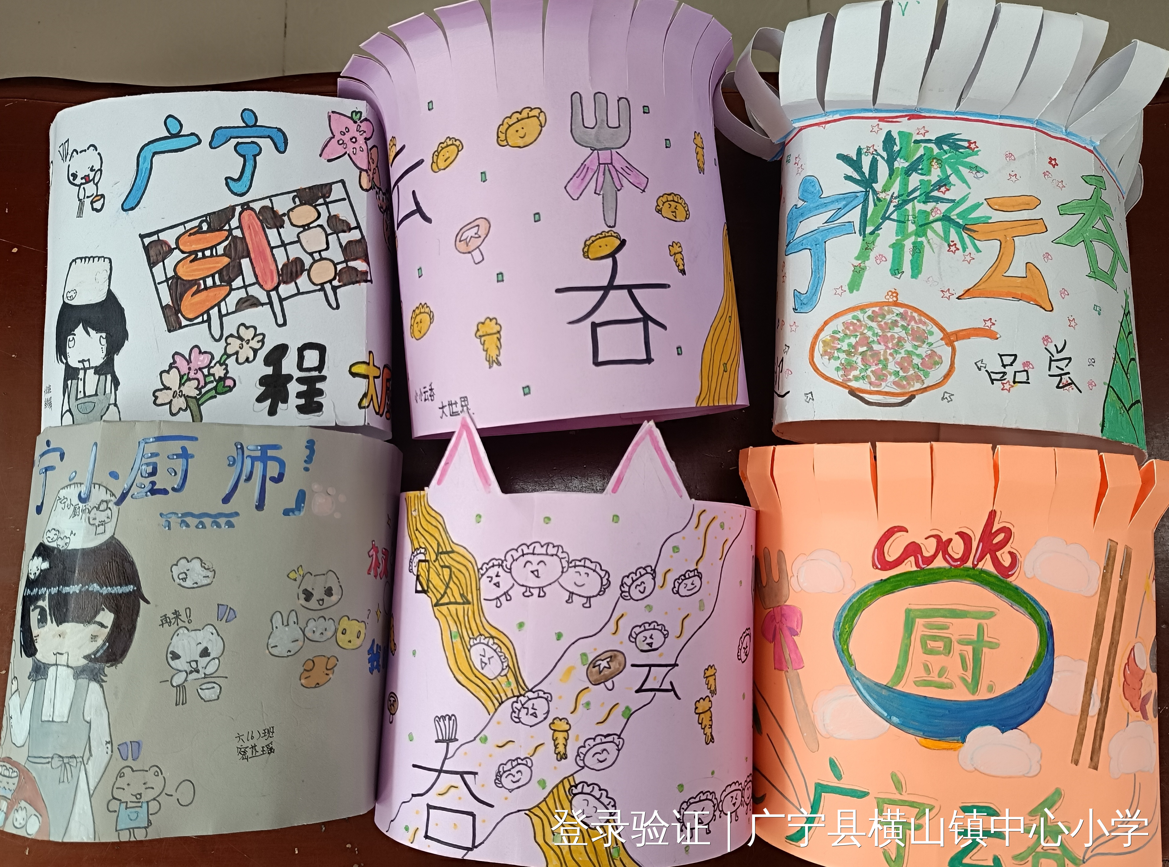 为提升学生跨学科学习的能力,培养劳动素养,活动前期,各班劳动教师指导学生用卡纸、黏土等材料做各具特色的厨师帽。同学们设计的厨师帽充分凸显“广宁云吞、竹乡风味”等元素,既融入了美术、劳动、语文等学科的知识,又表达了爱国怀乡的情怀。