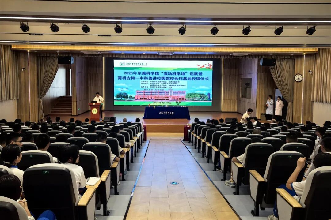 近日,东莞中学初中部麻涌古梅一中(以下简称:古梅一中)举行“科普进校园暨馆校合作基地授牌仪式”,通过优质资源联动,为师生搭建科学实践平台,激发创新活力。本次活动由东莞市科学技术协会、东莞市教育局主办,东莞科学馆、东莞市教育局教研室、麻涌镇科学技术协会、麻涌镇教育管理中心承办,特邀华南理工大学教授文尚胜、东莞理工学院博士魏亚东等专家现场指导。