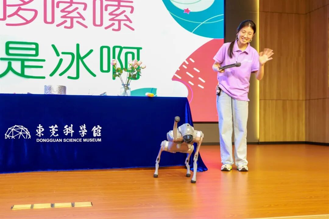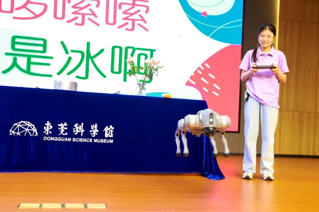 新报告厅内,一场精彩的科学秀表演拉开了序幕。炫酷的科学实验和热烈的互动瞬间点燃了全场的热情,尤其是灵活的机器狗展示,为古梅一中的学子们带来了一场集知识性、趣味性和互动性于一体的科普盛宴。