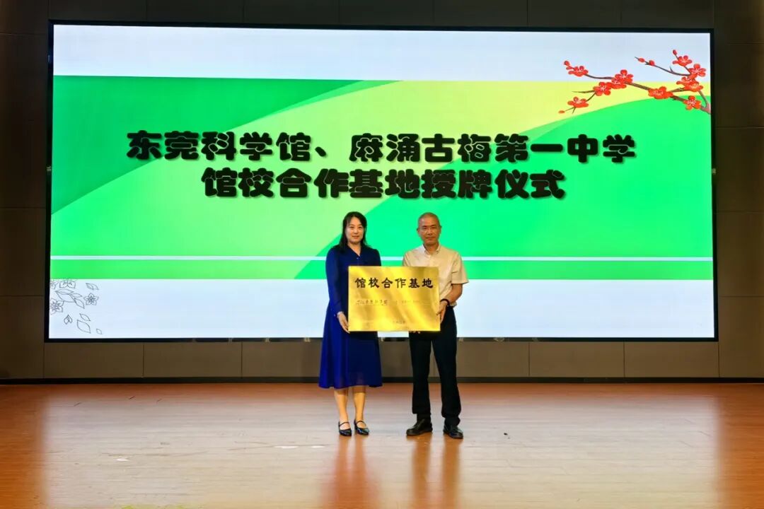 东莞科学馆相关负责人向古梅一中授予“馆校合作实践基地”牌匾。作为东莞科学馆在麻涌布局的首个中小学合作项目,此次授牌仪式不仅是双方教育资源深度融合的见证,更标志着古梅一中科技教育事业自此开启全新篇章。下来,科学馆将定期派专家到校指导,每月开展“科学大篷车”进校园活动,并为古梅一中师生提供专属的科普研学通道。