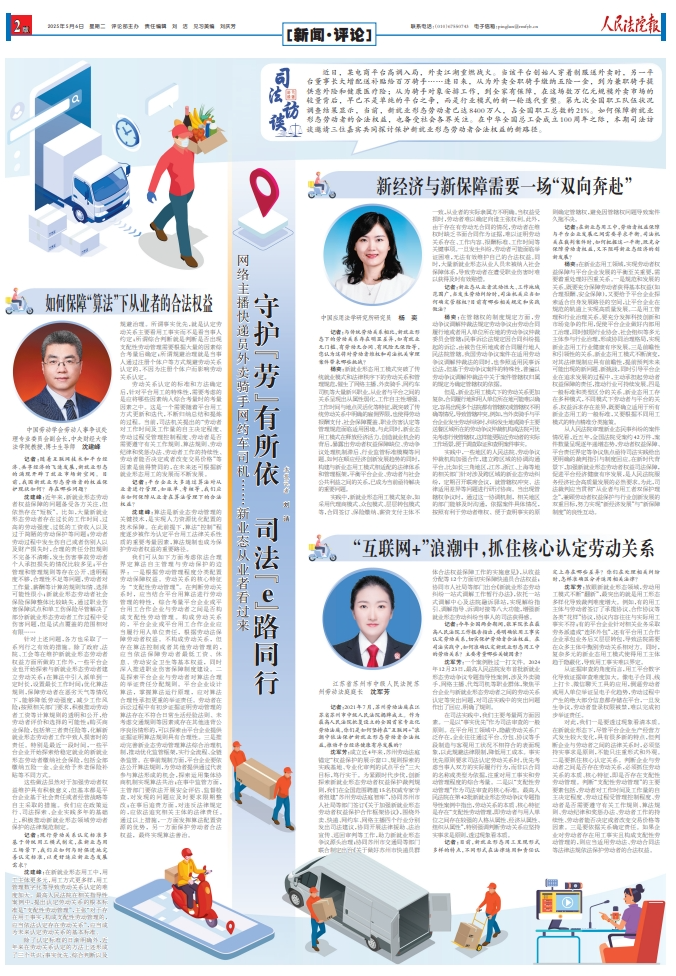沈军芳:成立近4年来,苏州劳动法庭锚定“权益保护的展示窗口、规则探索的实践基地、专业化审判的试点平台”三大目标,笃行实干。为紧跟时代步伐,创新探索新就业形态劳动者权益保护裁判规则,我们在全国范围聘邀15名权威专家学者组建“苏州劳动法庭智库”,协同苏州市人社局等部门签订《关于加强新就业形态劳动者权益保护合作框架协议》,围绕外卖、快递、网约车、网络主播四个行业分别发出司法建议,协同开展法律援助、法治宣传、巡回审判等工作,助力新就业形态争议源头治理;协同苏州市交通局等部门联合制定出台《关于做好苏州市快递员群体合法权益保障工作的实施意见》,从收益分配等12个方面切实保障快递员合法权益;协同市人社局等部门出台《新就业形态劳动纠纷一站式调解工作暂行办法》,依托一站式调解中心及法院融诉驿站,实现解纷指引、调解指导、诉调对接等八大功能,增强新就业形态劳动纠纷当事人的司法获得感。