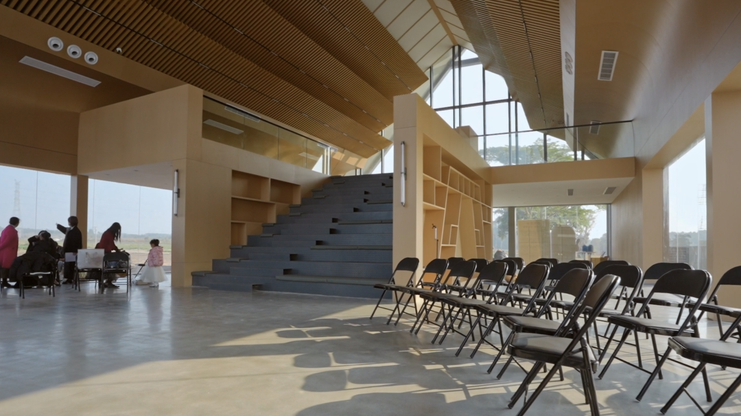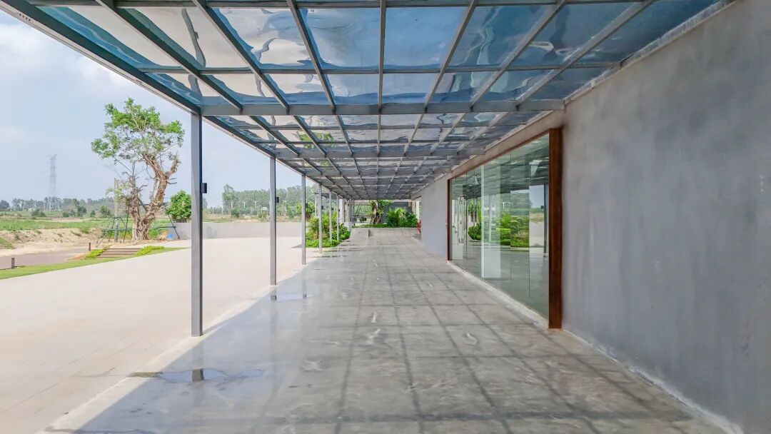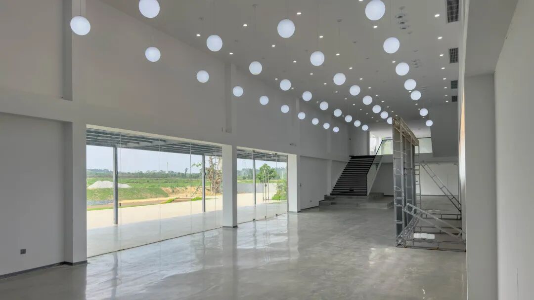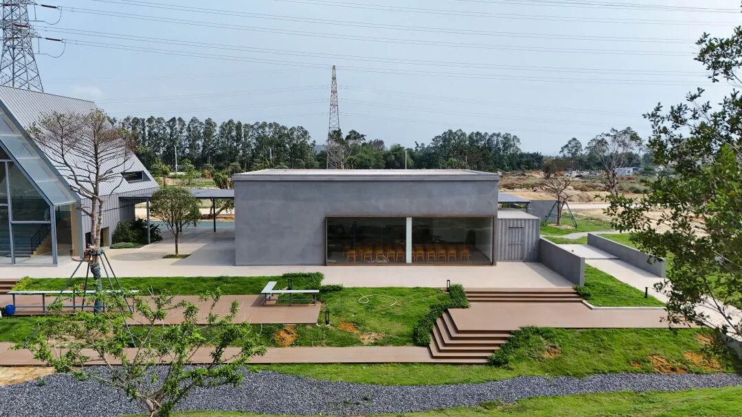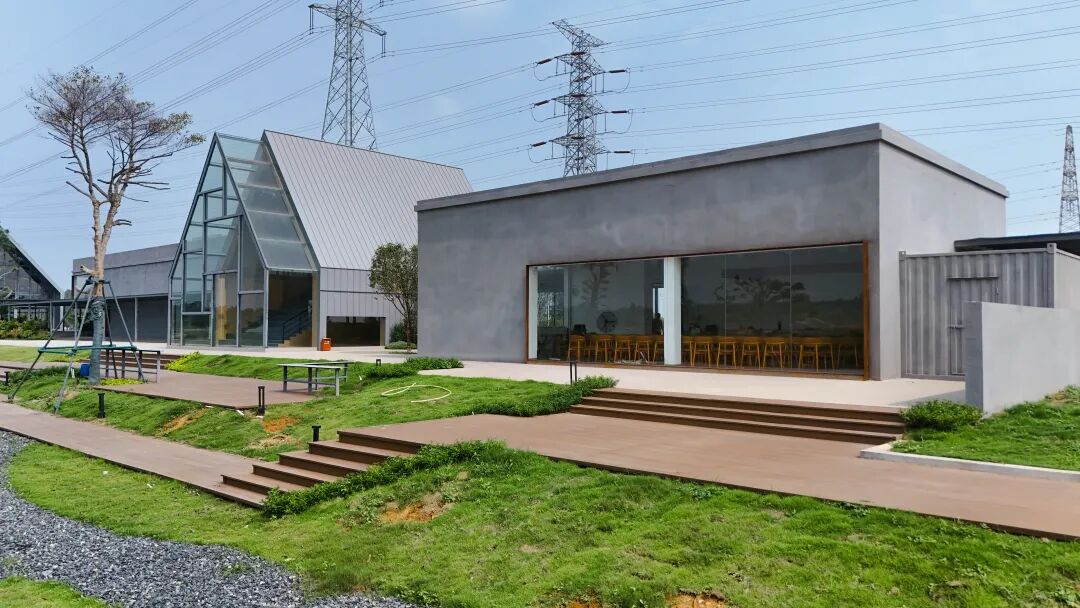 各场馆随处可见的全落地式玻璃幕墙,犹如一块巨大的方镜立于天地之间,将自然田园风光映入其中,随四季变换展现出不同的美丽。