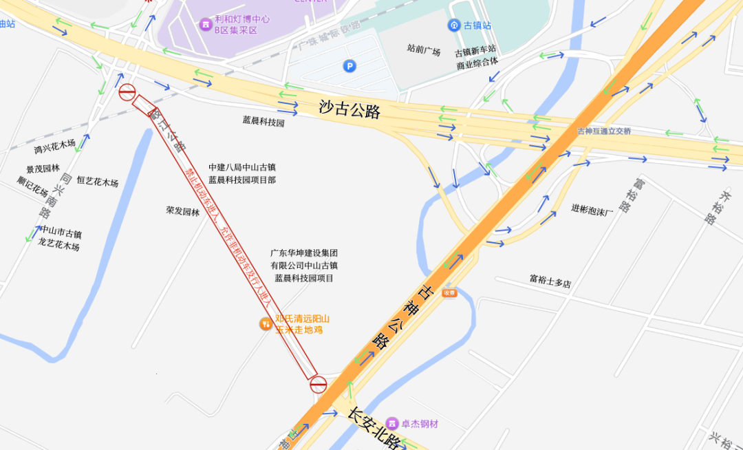 因古镇镇古神公路与古镇快线互通立交工程新建向阳二路施工需要,中山市交通项目建设有限公司计划于2025年5月9日至2025年6月9日对岐江公路、古神公路及长安北路交会处和同兴南路、岐江公路交会处进行围蔽施工。施工期间,中山市公安局古镇分局将对上述路段交汇处进行交通管制,具体管制路段和绕行路线见交通疏导图。