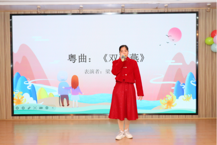 梁带喜在舞台上唱粤曲。梁带喜参与志愿服务或站在舞台上的大部分时候,都涂了口红,穿了红裙子,用火红的颜色彰显着生命的张力与无限的热爱。