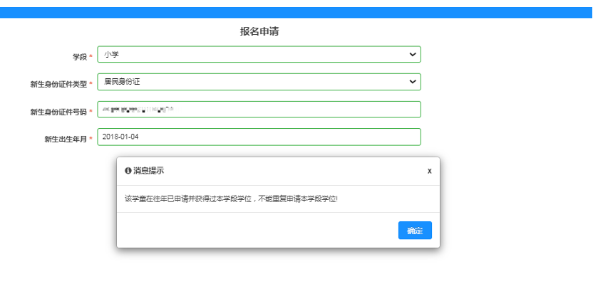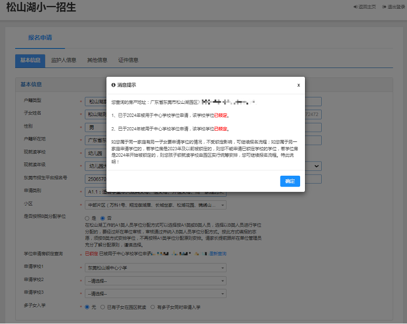 松山湖入学管理平台实行查重管理,往年已申请过本学段学位的不能重复申请本学段学位。若学童往年未就读教育部门安排的免费义务教育学位(含政府购买的公民办学校学位),家长可在“松山湖入学管理平台”点击“入学咨询”将学生的基本信息在线反馈(姓名、身份证号、现就读年级)或致电0769-38881212,将学生的基本信息(姓名、身份证号、现就读年级)告知工作人员,经教育部门核实后,系统进行解锁,解锁后可继续参与报名申请。