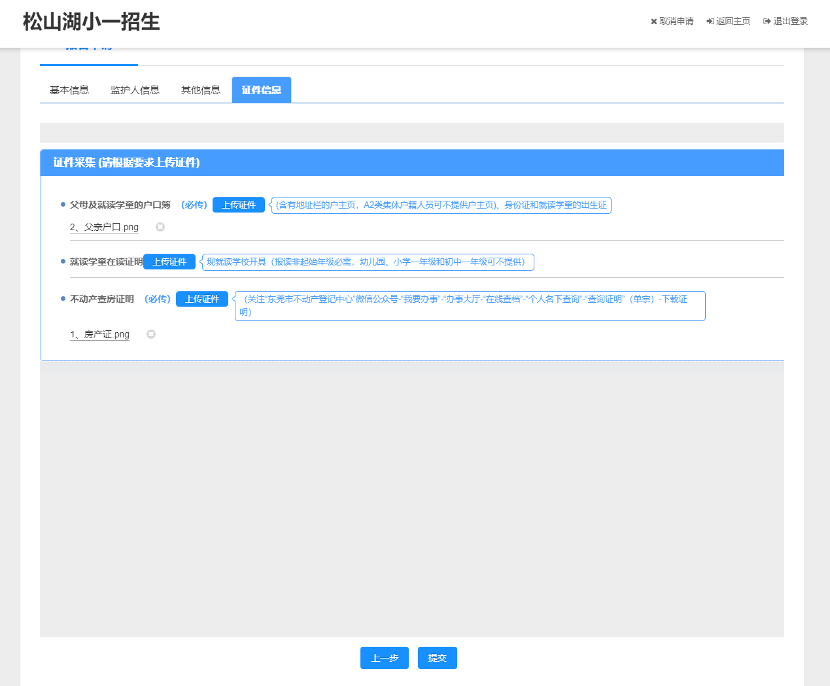 9、相关证件上传完成后,确认学生信息、监护人信息、其他信息填写正确后,点击“提交”。