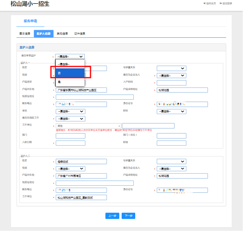 6、“监护人信息”页面:本页面需填写完整,否则无法进入下一步。(注:当新生为单亲家庭时,是否单亲监护选“是”,则仅需录入单亲监护人信息)。