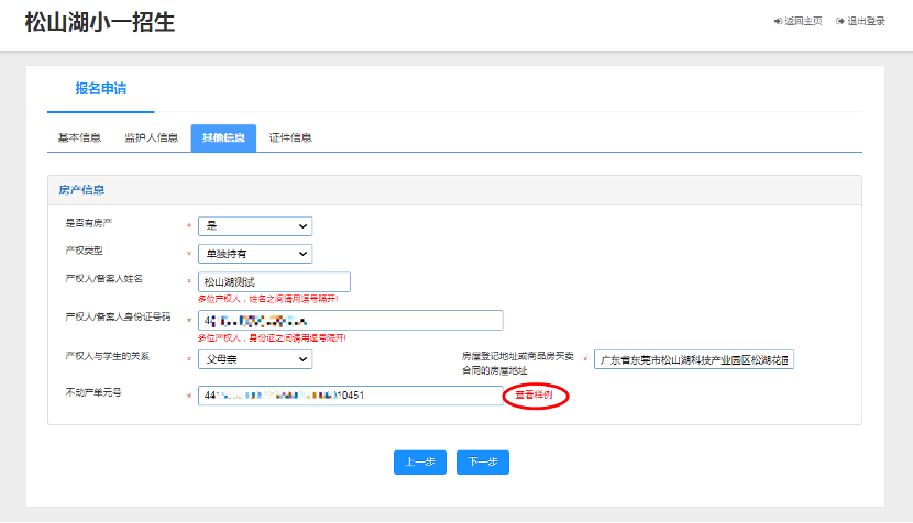 7、“其他信息”页面,根据实际情况填写完整后,点击“下一步”不对产单元号的填写可点击“查看样例”进行参考填写。