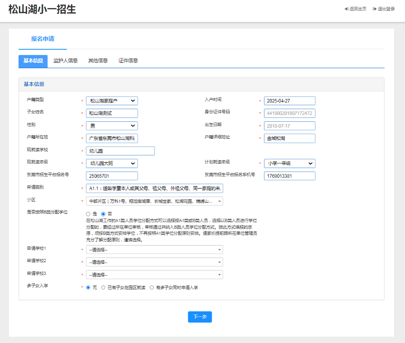 5、进入到“报名申请”页面,请按实际情况依次填写:基本信息>>监护人信息>>其他信息>>证件信息。“基本信息”页面,身份证号码和出生日期不可修改,本页面填写完整后,点击“下一步”。