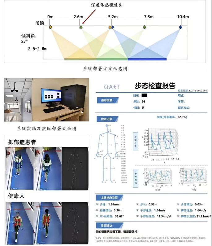 基于智能步态分析的无扰式抑郁症检测系统由深圳北理莫斯科大学人工智能研究院的胡希平教授团队独立研发。该系统借助计算机视觉和大数据分析等技术手段,以抑郁症患者与健康人在日常运动步态信息中的差异为切入点,通过计算机模型分析识别出异常步态特征,从而实现对检测对象患抑郁症概率及程度的无扰式判别。此系统可与日常生活中广泛部署的视频监控相结合,实现对目标群体的快速、无干扰的、智能的、大规模的潜在抑郁症筛查。