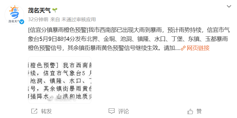 信宜市气象台5月9日8时4分发布北界、金垌、池洞、镇隆、水口、丁堡、东镇、玉都暴雨橙色预警信号,其余镇街暴雨黄色预警信号继续生效。
