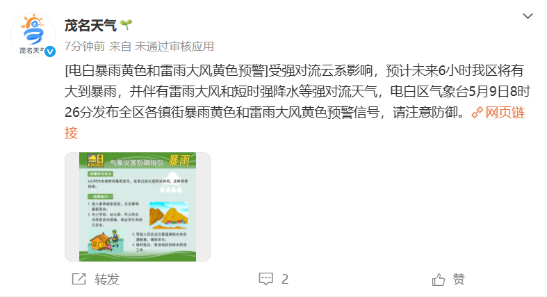 电白区气象台5月9日8时26分发布全区各镇街暴雨黄色和雷雨大风黄色预警信号。