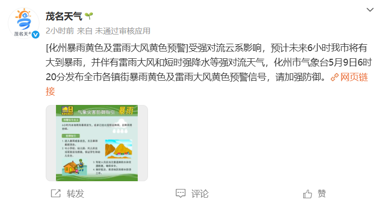 化州市气象台5月9日6时20分发布全市各镇街暴雨黄色及雷雨大风黄色预警信号。