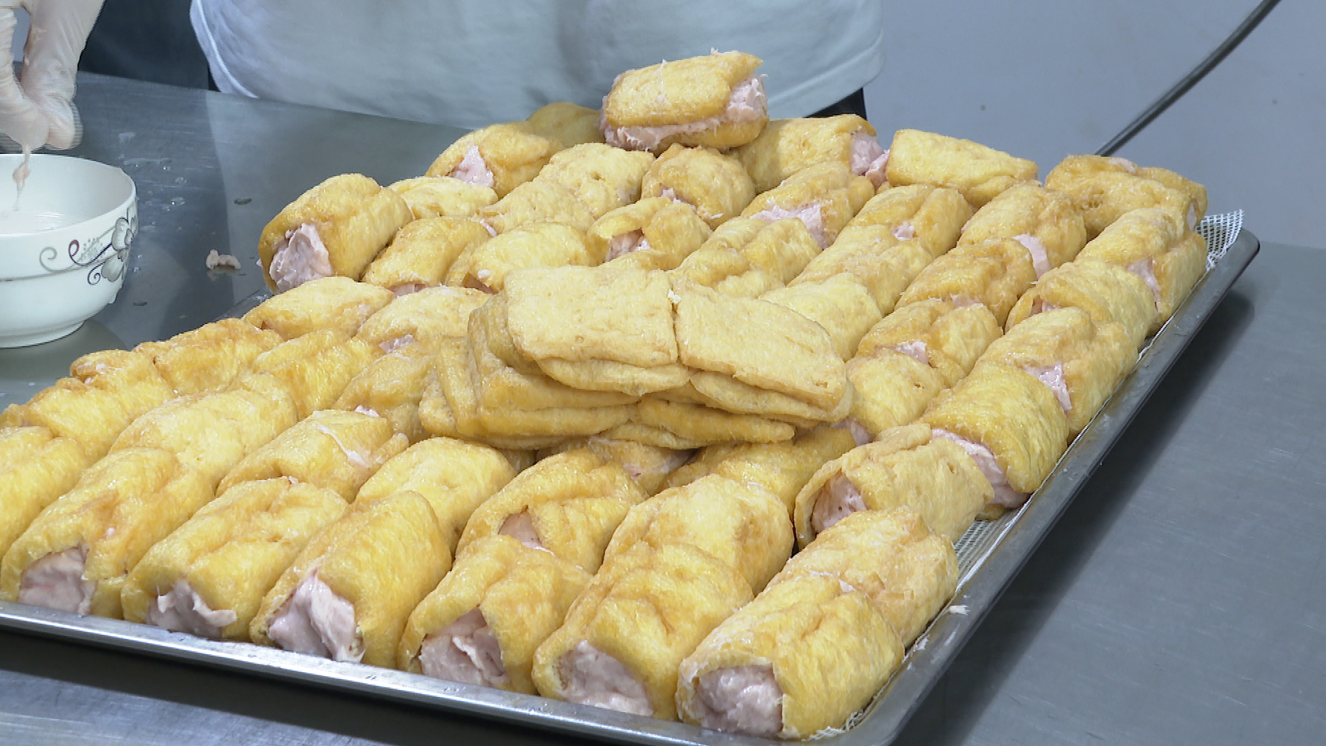 在佗城的一家传统豆腐丸制作作坊里,青年干部们在工作人员的悉心指导下,依次完成打馅、包馅、蒸制等制作步骤。大家巧手翻飞,将剁好的馅料巧妙地包裹进豆腐皮中,经过精心塑形后,一个个圆润饱满、色泽诱人的豆腐丸便制作完成。“豆腐丸作为一种客家传统美食,我们从小到大都经常吃,这次活动让我第一次亲身体验豆腐丸的制作过程,了解我们的非物质文化遗产,感觉非常有意义。”佗城镇干部马小敏表示。