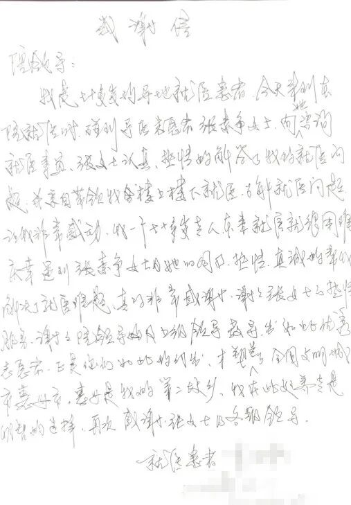 “我是七十多岁的异地就医患者,今天来到医院就医时,碰到在医院服务的志愿者张素争女士,向她咨询就医事宜,张女士认真、热情地解答了我的就医问题,并亲自带领我楼上楼下就医,了解就医问题,让我非常感动……”