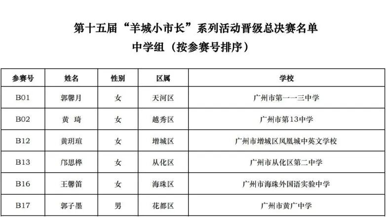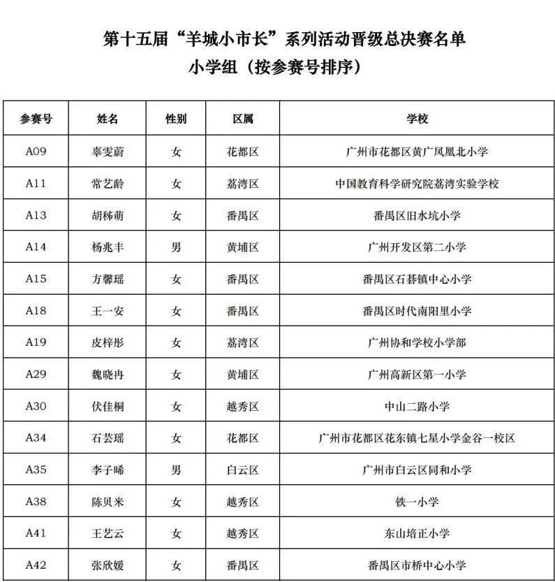 根据半决赛“社会调研”“特长展示”两个项目的成绩综合统计排名,现公布小学组前14名,中学组前6名选手入围总决赛的名单。