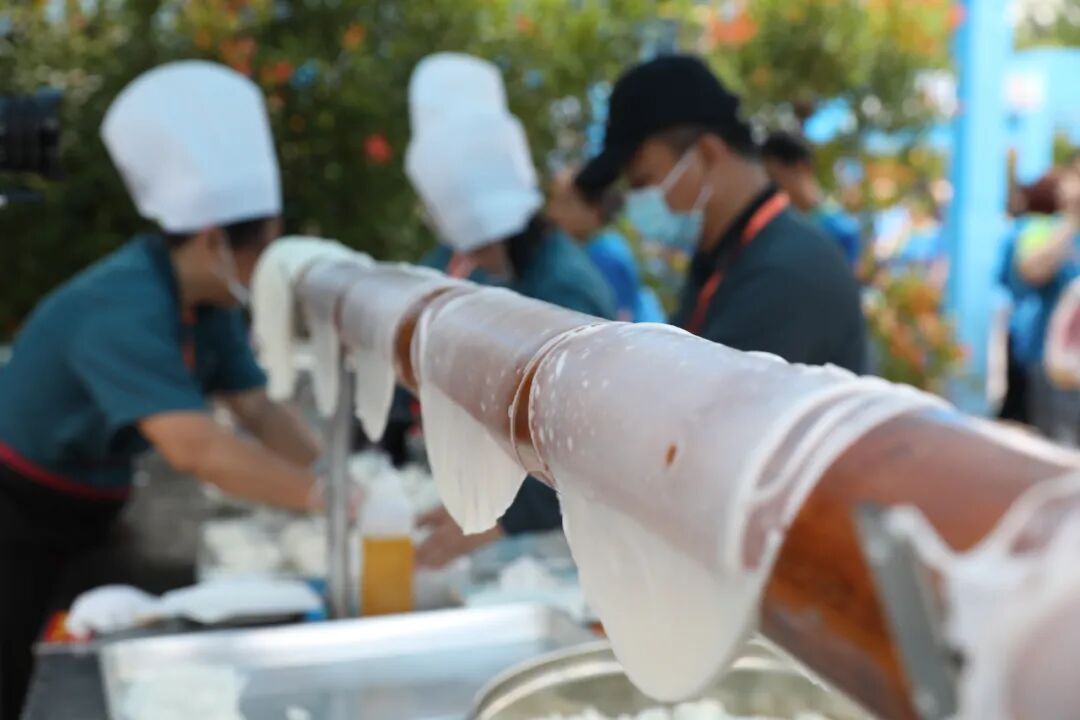 竹篙粉是德庆县颇具特色的风味小吃,其最大特色在于蒸好的粉皮要在大簕竹篙上晾凉后再切条食用。这样制作的竹篙粉口感爽弹韧滑,明显区别于普通河粉。