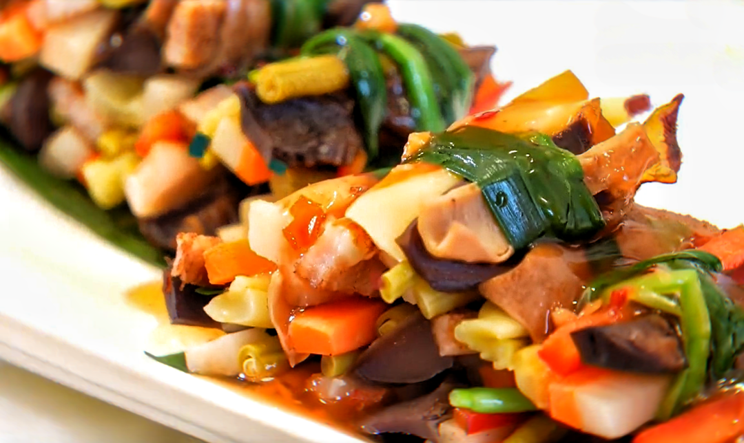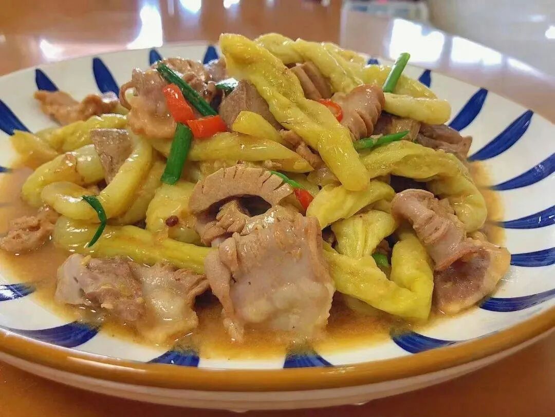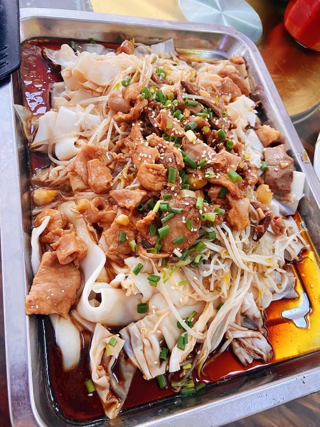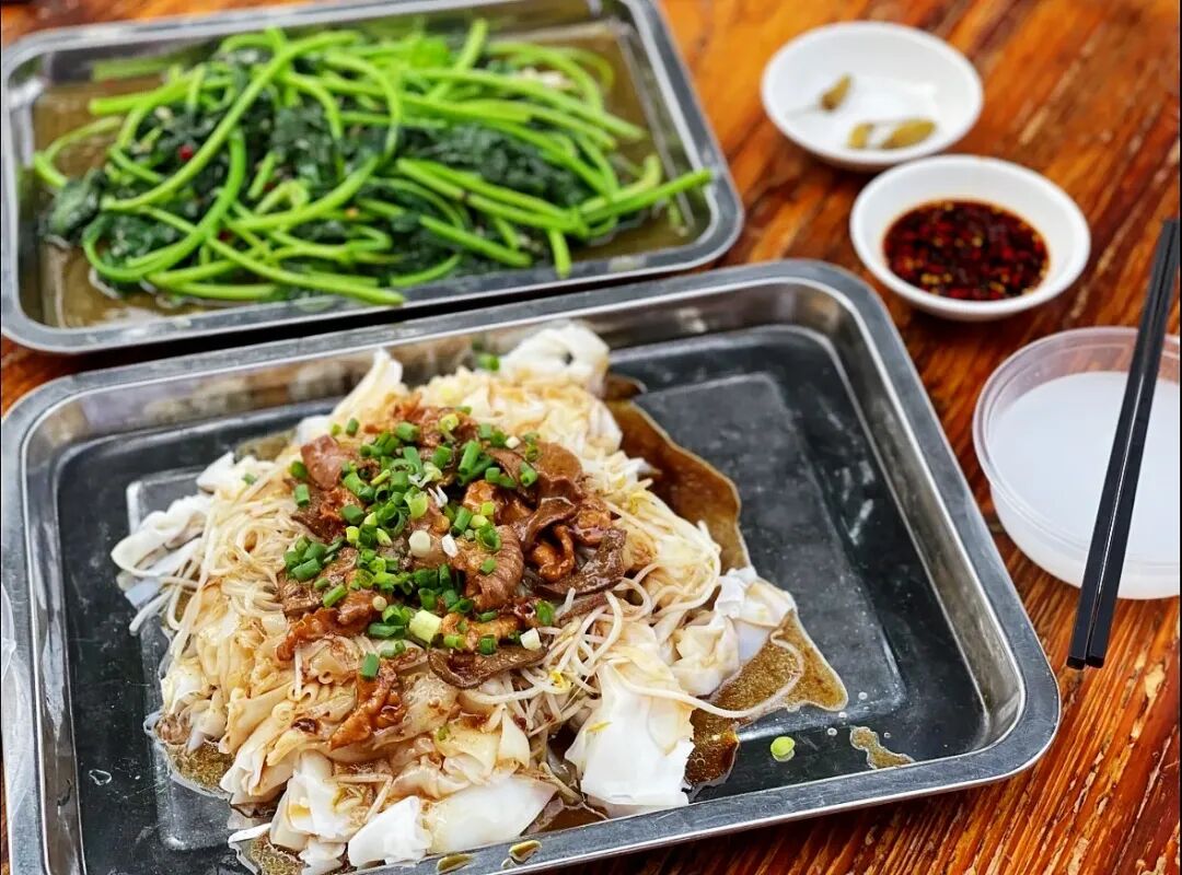 除了“斋粉”,竹篙粉也可以搭配荤菜,洁白的竹篙粉淋上香浓汁稠的现炒猪杂、牛腩等,柔韧爽滑的粉裹着肉香浓郁的酱汁,再来一份脆嫩爽口的炒瓜苗、一碗白粥,热腾腾的香气裹挟着市井烟火气扑面而来,这是德庆人最寻常的饮食记忆。