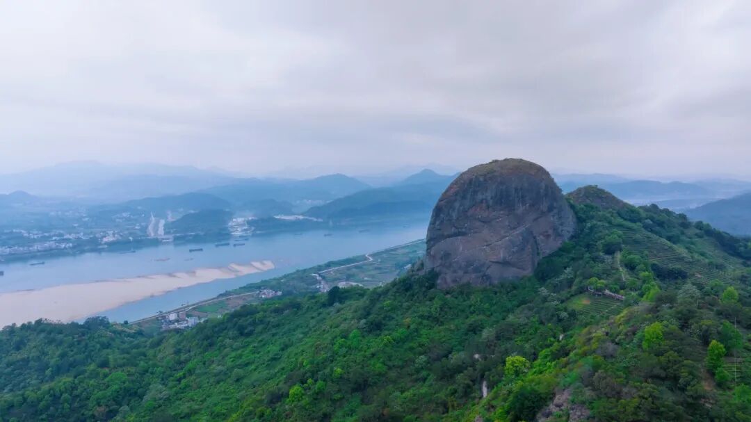沿着登山石阶步道拾级而上,穿越葱郁林木,抵达山顶平台,俯瞰西江蜿蜒如带。