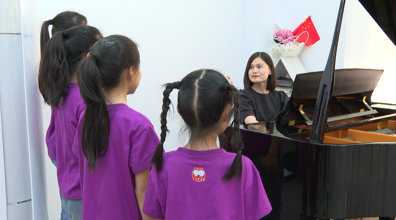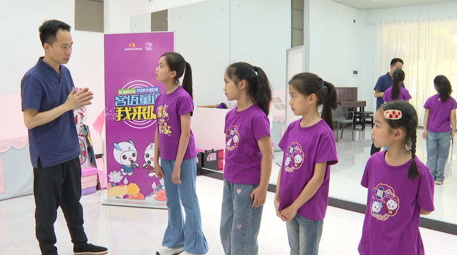 走进7街音乐排练室,四位客语童谣传唱人正与指导老师默契配合,反复打磨《崖是小客家》《嘟春车》《记得锡自家》《桂花谣》等经典曲目。稚嫩的童声中饱含深情,每一次发声、每一个节拍,都凝聚着对客家文化的热爱与传承的决心。“为更好地呈现作品,我们每天放学后都会准时来到这里排练。我们要认真唱好客语童谣,通过歌声让更多人认识龙川、了解龙川,将家乡的文化传播得更远。” 龙川客语童谣传唱人郑畋眼神坚定地说道。