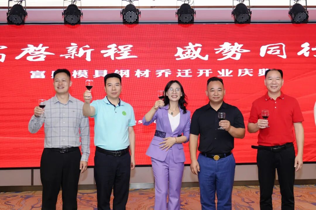 祝酒仪式将气氛推向高潮,五位主礼嘉宾执杯共庆,台下酒杯交相辉映,共贺富盛乔迁大吉。