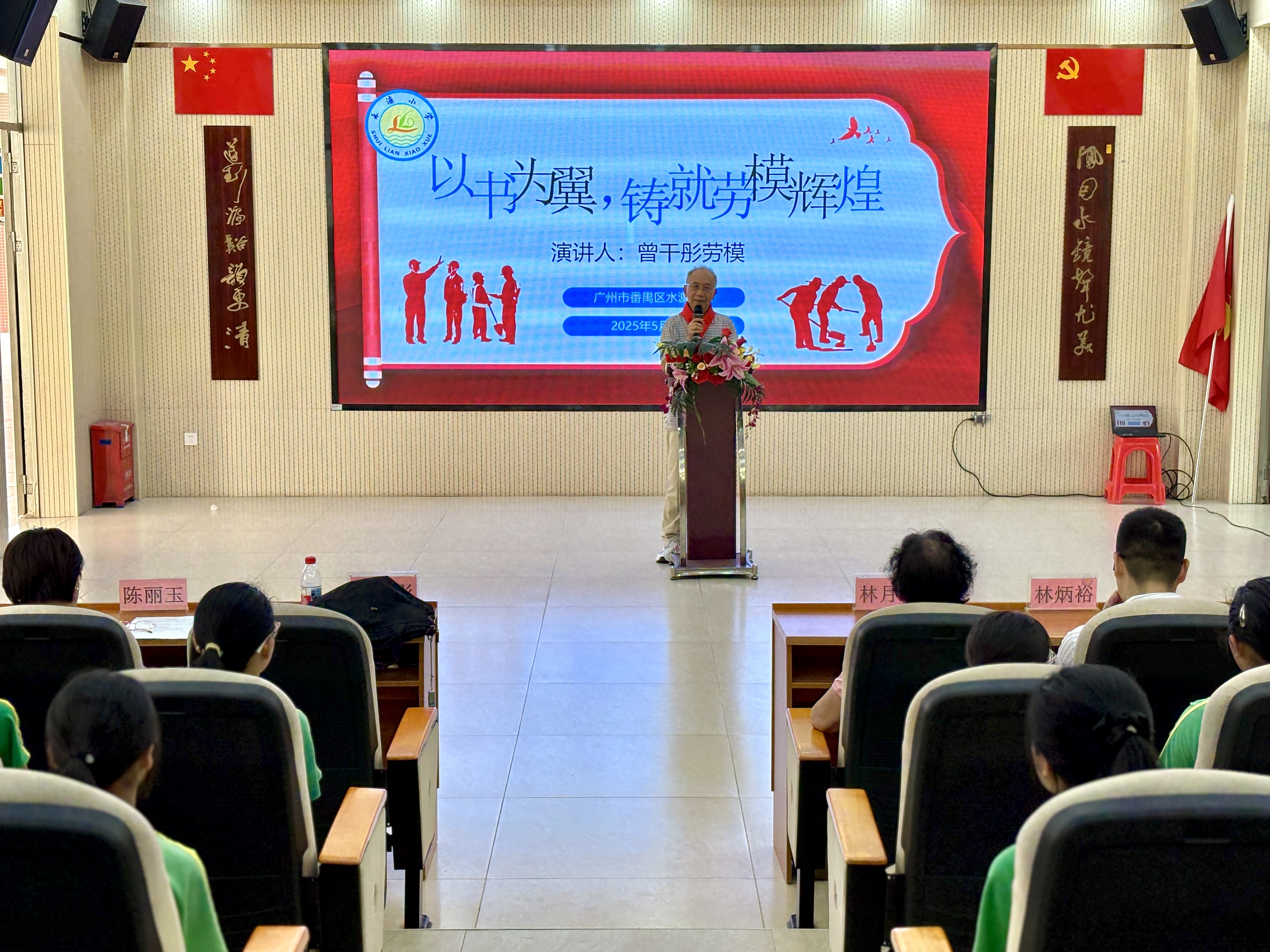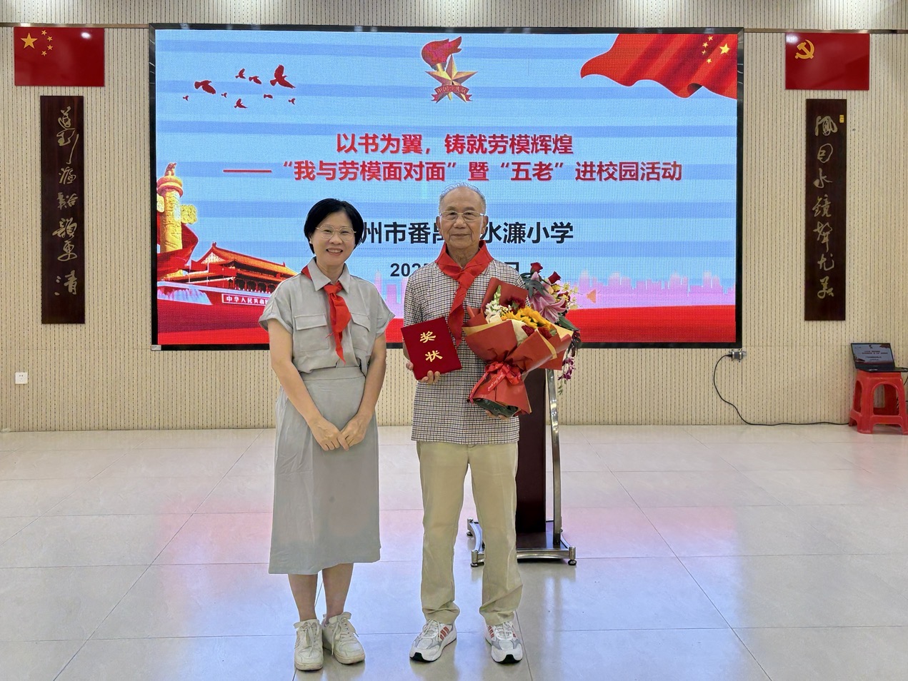当天,以“以书为翼,铸就劳模辉煌”为主题的“我与劳模面对面”暨“五老”进校园活动在水濂小学举行。下午三点,当曾干彤爷爷在少先队员敬献红领巾的仪式中缓缓走上讲台时,现场100余名师生自发起立鼓掌,掌声经久不息。