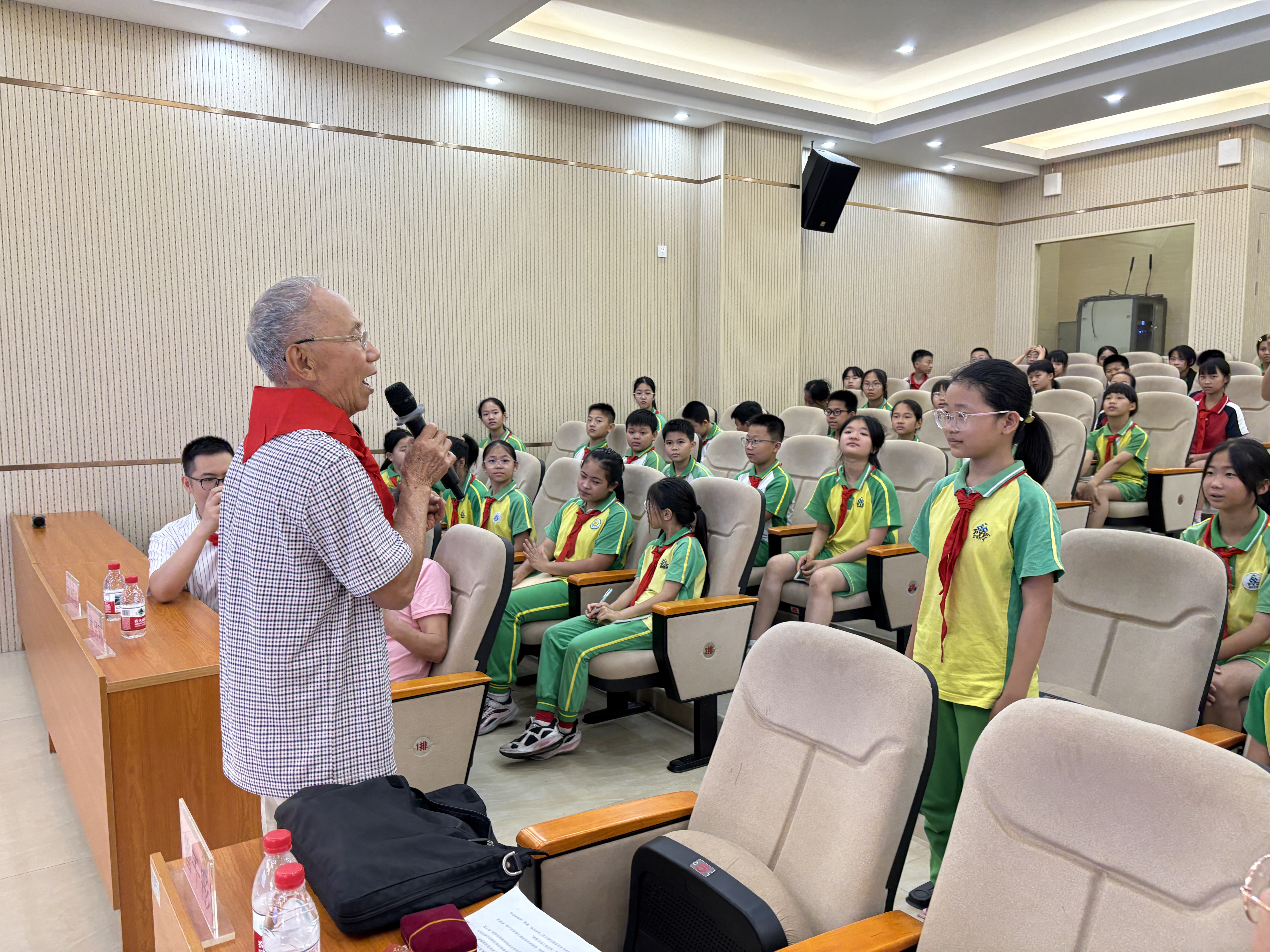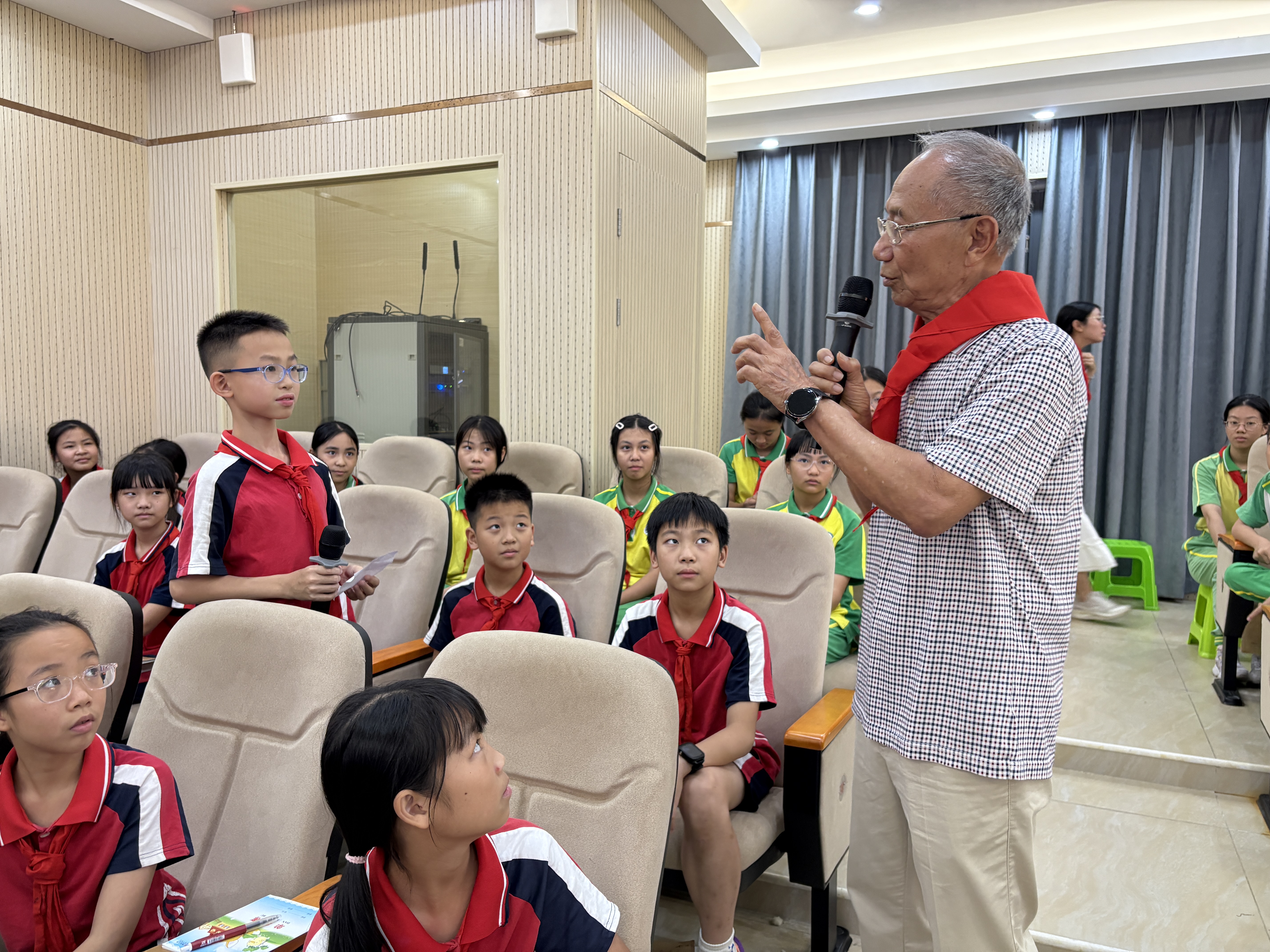 “爷爷,这么难的工程您真的没打过退堂鼓吗?”“当时遇到技术难题,您是怎么找到解决办法的?”5月14日下午,广州市番禺区水濂小学的电教室里,此起彼伏的提问声、热烈的掌声交织成一片,气氛热烈堪比粉丝见面会。1995年全国劳动模范、86岁的番禺区交通局原副局长曾干彤刚分享完建设市南公路的奋斗故事,立刻被举着话筒、高举手臂的“小记者”们团团围住,一场跨越时代的对话就此展开。
